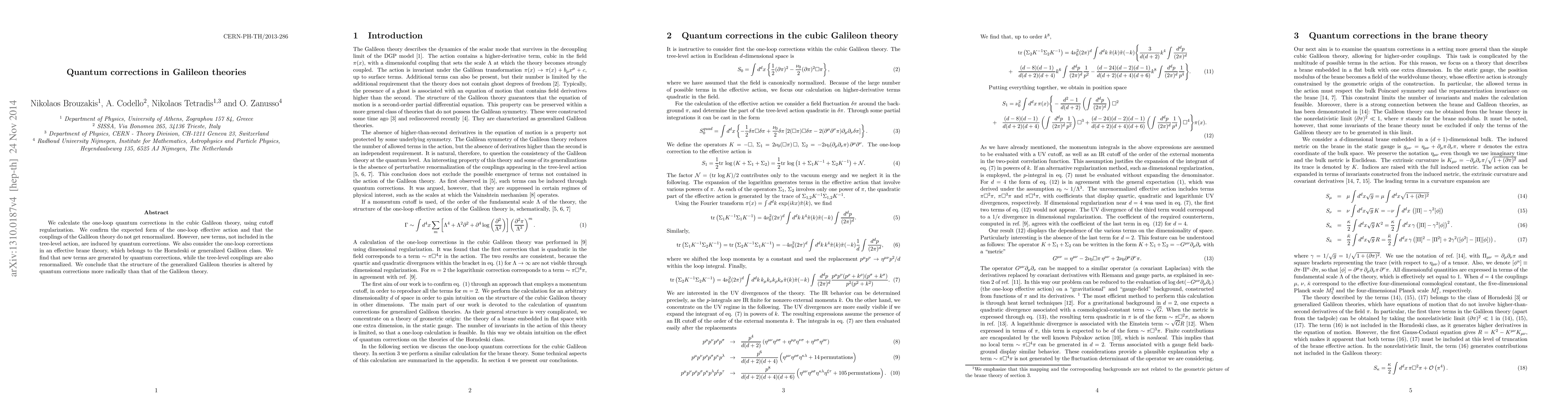 We calculate the one-loop quantum corrections in the cubic Galileon theory, using cutoff regularization. We confirm the expected form of the one-loop effective action and that the couplings of the Galileon theory do not get renormalized. However, new terms, not included in the tree-level action, are induced by quantum corrections. We also consider the one-loop corrections in an effective brane theory, which belongs to the Horndeski or generalized Galileon class. We find that new terms are generated by quantum corrections, while the tree-level couplings are also renormalized. We conclude that the structure of the generalized Galileon theories is altered by quantum corrections more radically than that of the Galileon theory.