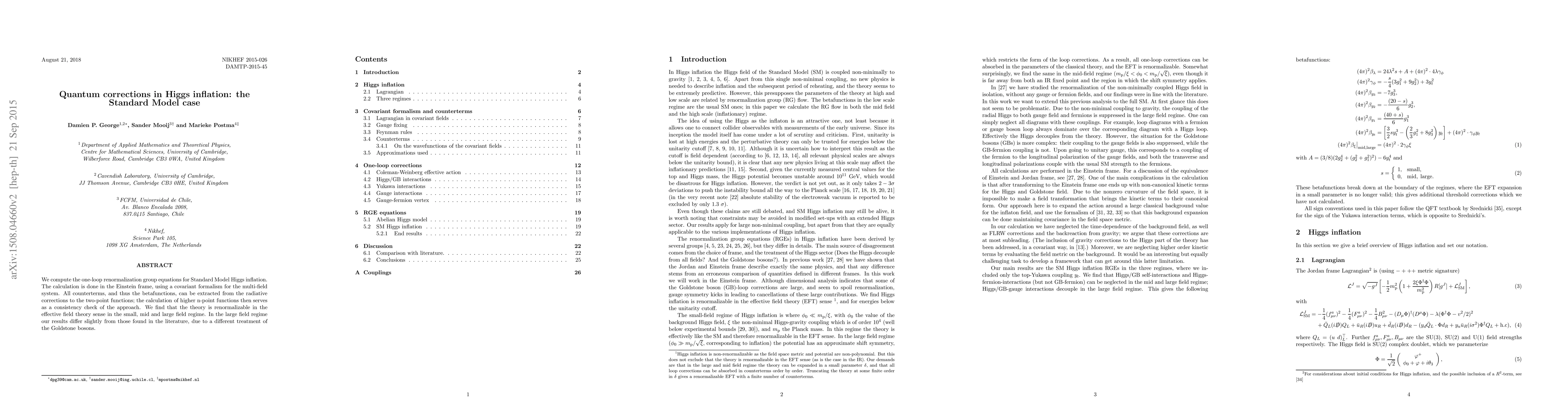 We compute the one-loop renormalization group equations for Standard Model Higgs inflation. The calculation is done in the Einstein frame, using a covariant formalism for the multi-field system. All counterterms, and thus the betafunctions, can be extracted from the radiative corrections to the two-point functions; the calculation of higher n-point functions then serves as a consistency check of the approach. We find that the theory is renormalizable in the effective field theory sense in the small, mid and large field regime. In the large field regime our results differ slightly from those found in the literature, due to a different treatment of the Goldstone bosons.
