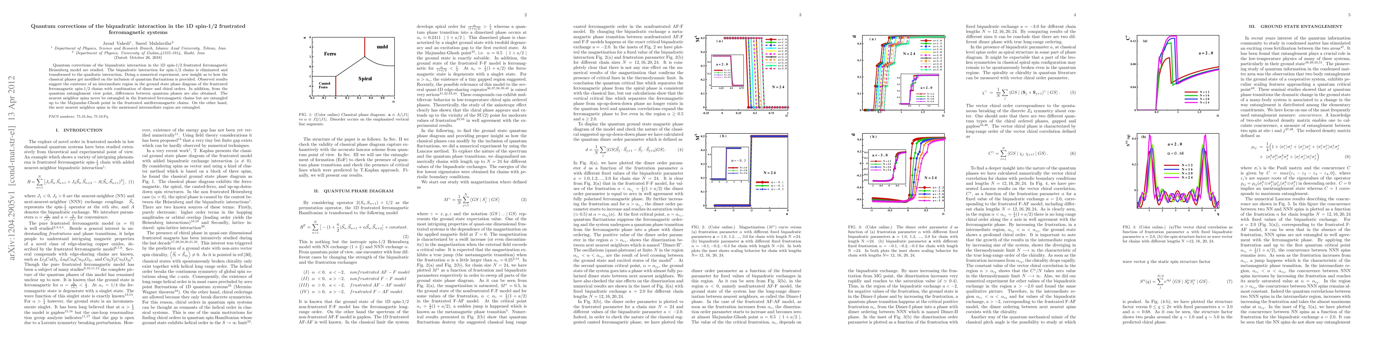 This paper explores quantum corrections to the biquadratic interaction in 1D spin-1/2 frustrated ferromagnetic systems, revealing an intermediate region in the ground state phase diagram characterized by dimer and chiral orders. Quantum fluctuations modify classical phases, and entanglement patterns differ between ferromagnetic and antiferromagnetic chains.