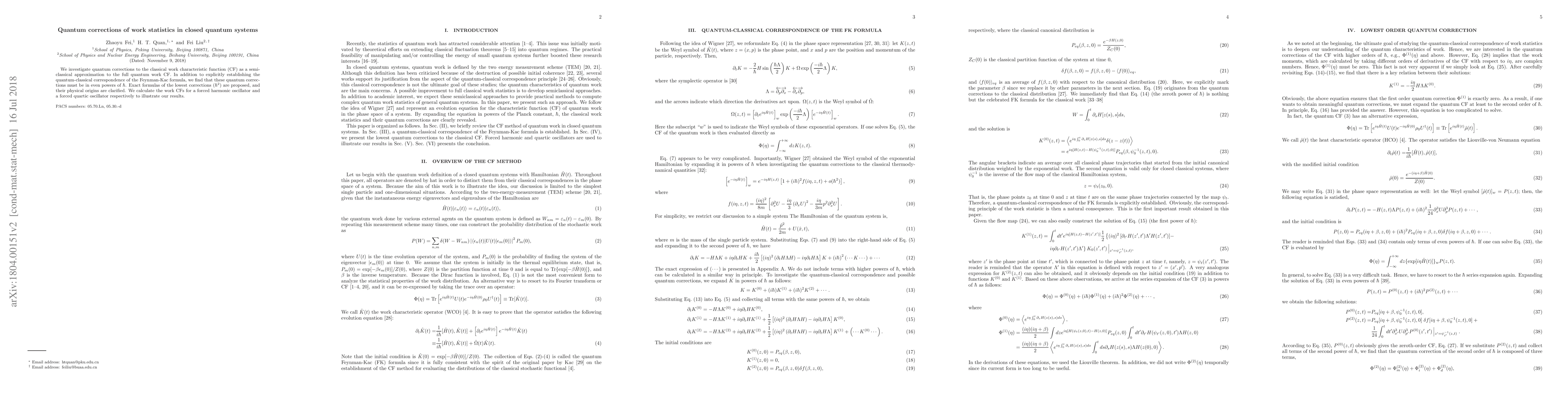 This paper explores quantum corrections to the classical work characteristic function in closed quantum systems, establishing that these corrections are in even powers of $\hbar$. The authors propose exact formulas for the lowest quantum corrections ($\hbar^2$) and illustrate their findings with calculations on forced harmonic and quartic oscillators.