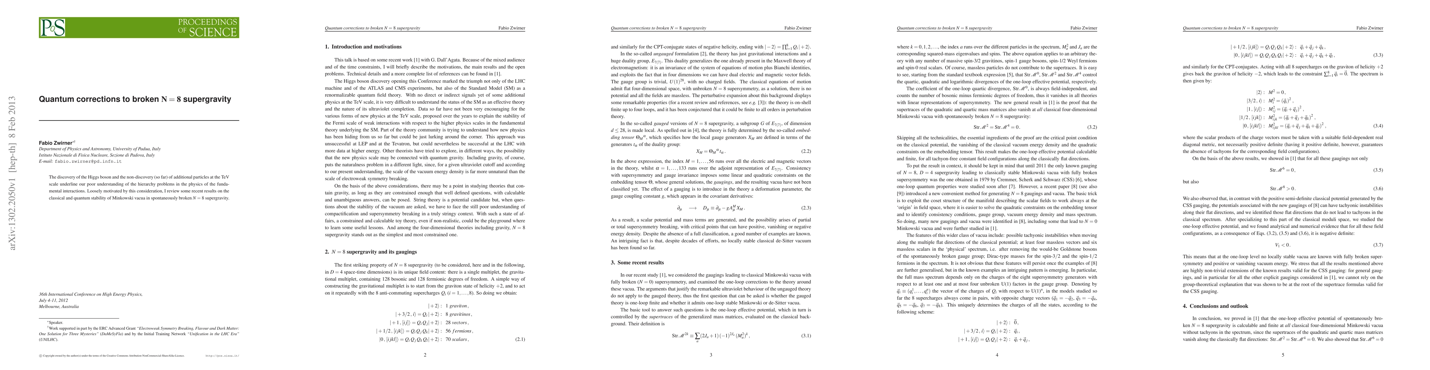 Summary: This paper reviews recent findings on the stability of Minkowski vacua in spontaneously broken N=8 supergravity, addressing the hierarchy problems in fundamental interactions, with a focus on quantum corrections to this theoretical framework.