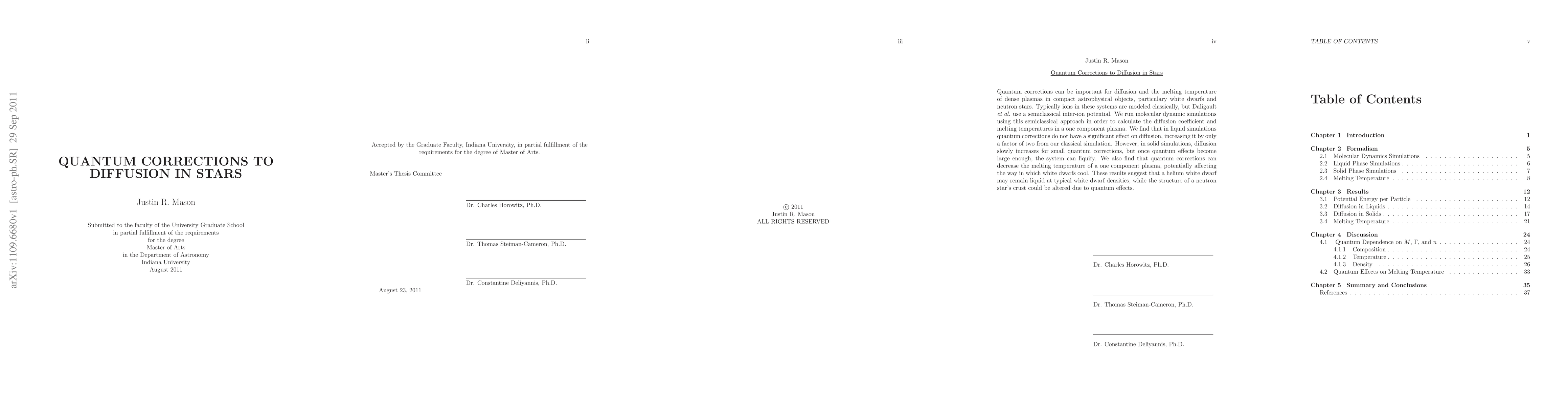 Quantum corrections can be important for diffusion and the melting temperature of dense plasmas in compact astrophysical objects, particulary white dwarfs and neutron stars. Typically ions in these systems are modeled classically, but Daligault et al. use a semiclassical inter-ion potential. We run molecular dynamic simulations using this semiclassical approach in order to calculate the diffusion coefficient and melting temperatures in a one component plasma. We find that in liquid simulations quantum corrections do not have a significant effect on diffusion, increasing it by only a factor of two from our classical simulation. However, in solid simulations, diffusion slowly increases for small quantum corrections, but once quantum effects become large enough, the system can liquify. We also find that quantum corrections can decrease the melting temperature of a one component plasma, potentially affecting the way in which white dwarfs cool. These results suggest that a helium white dwarf may remain liquid at typical white dwarf densities, while the structure of a neutron star's crust could be altered due to quantum effects.