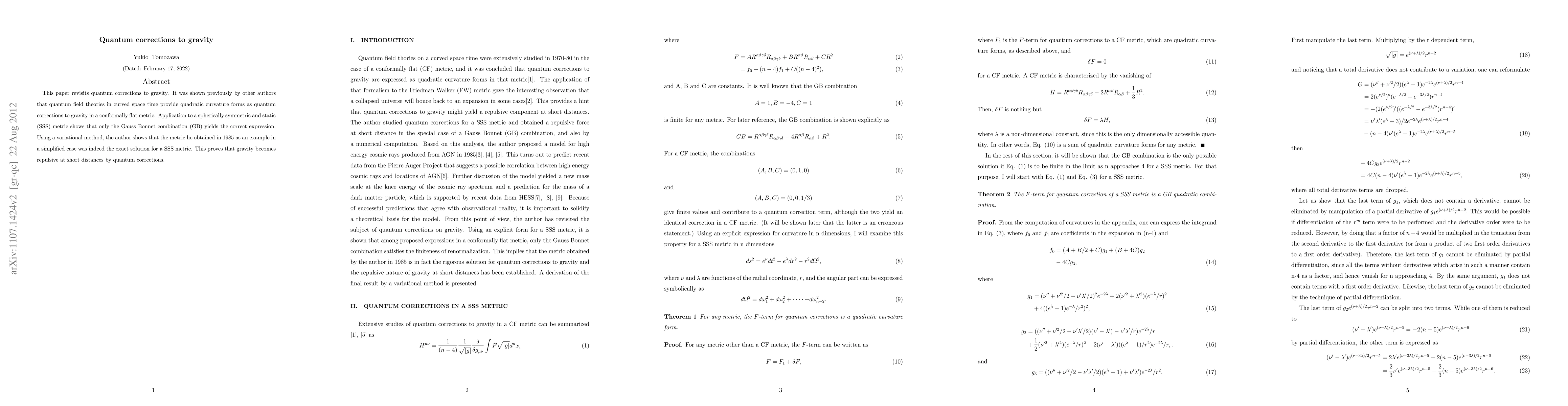 This paper revisits quantum corrections to gravity. It was shown previously by other authors that quantum field theories in curved space time provide quadratic curvature forms as quantum corrections to gravity in a conformally flat metric. Application to a spherically symmetric and static (SSS) metric shows that only the Gauss Bonnet combination (GB) yields the correct expression. Using a variational method, the author shows that the metric he obtained in 1985 as an example in a simplified case was indeed the exact solution for a SSS metric. This proves that gravity becomes repulsive at short distances by quantum corrections.