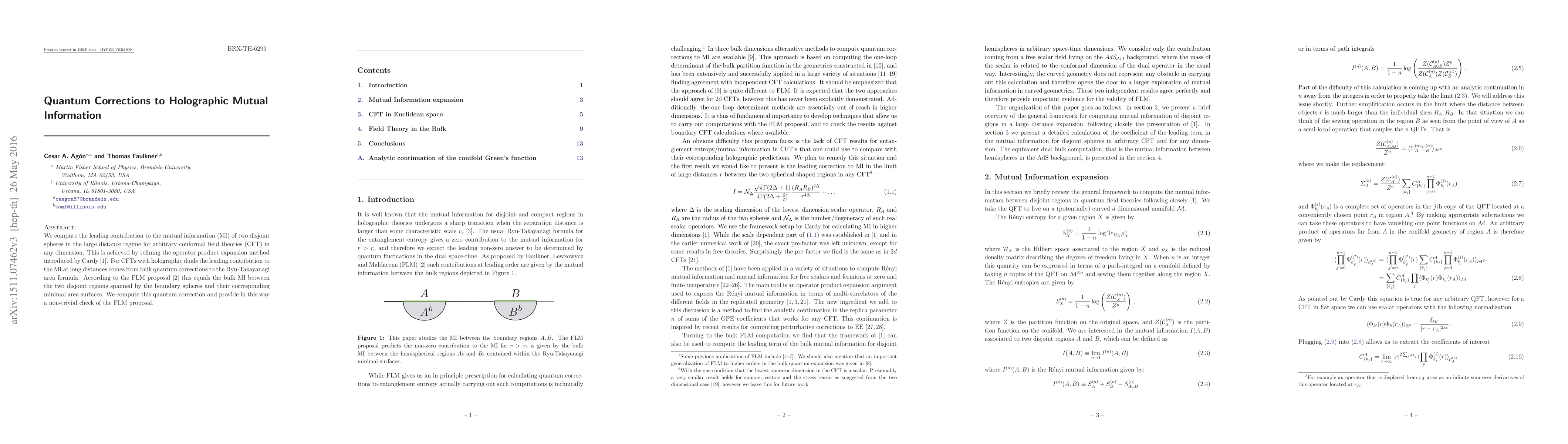 This paper computes the leading quantum corrections to the mutual information between two disjoint spheres in large distance regimes for arbitrary conformal field theories, using refined operator product expansion methods. It provides a non-trivial check of the FLM proposal by showing that these corrections correspond to the bulk mutual information in holographic duals.