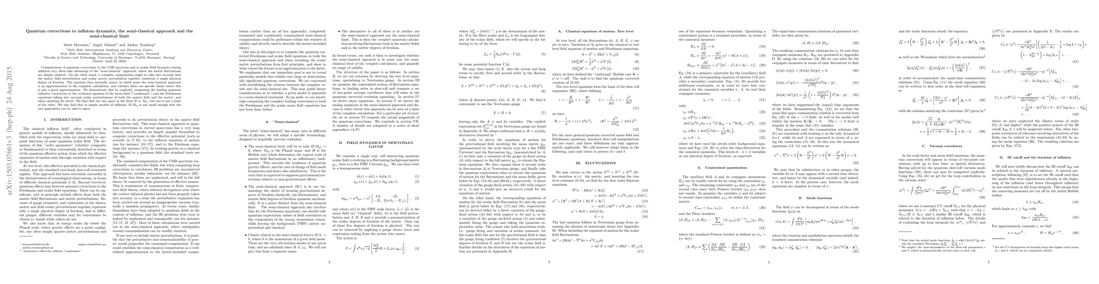 Computations of quantum corrections to the CMB spectrum and to scalar field dynamics during inflation very often take advantage of the "semi-classical" approach, where the metric fluctuations are simply omitted. On the other hand, a complete computation ought to take into account that the matter field perturbation and scalar metric perturbation together constitute a single physical degree of freedom. The question then naturally arises, in which sense the semi-classical approach is an approximation to the complete calculation, and whether there are specific limits where this is also a good approximation. We consider the quantum corrected dynamics of interacting scalar fields in an expanding inflationary background. We demonstrate this by explicitly computing the leading quantum radiative corrections to the evolution equation of the mean field ("condensate") and the Friedmann equations taking into account scalar perturbations of both the matter field and the metric, and when omitting the latter. We find that the two agree in the limit H << M_pl , but one is not a limit of the other. We also find that in simple models of inflation, H/M_pl is not small enough that the two approaches can be said to agree. By direct comparison, we demonstrate how to interpret the "semi-classical" approach often employed in more complex computations as a well-defined approximation, and quantify its validity.