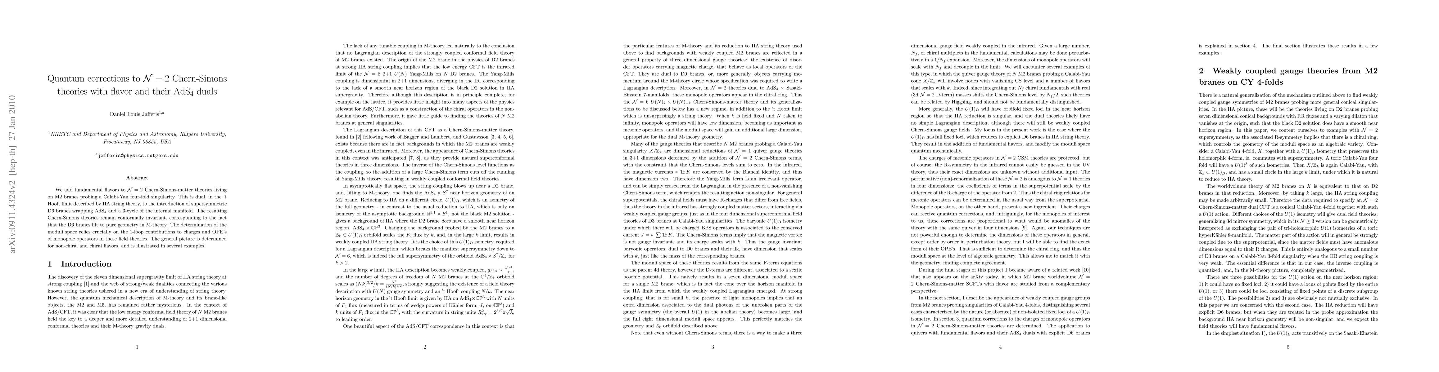 Summary: This research explores the addition of fundamental flavors to N=2 Chern-Simons-matter theories on M2 branes, with an AdS4 dual in IIA string theory involving D6 branes. It focuses on the conformal invariance of the resulting theories and the role of 1-loop quantum corrections in determining the moduli space.