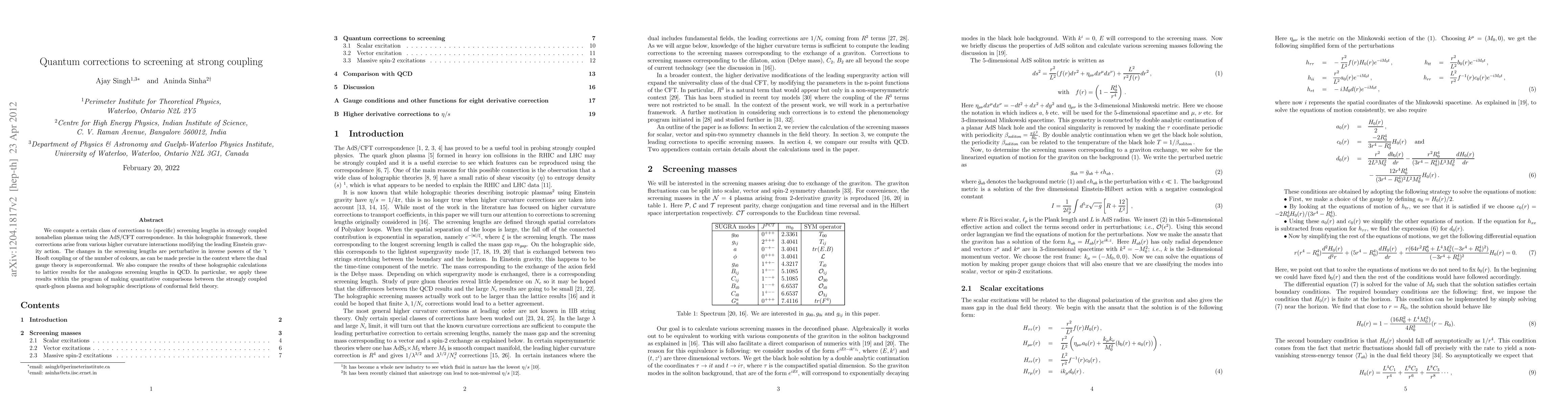 We compute a certain class of corrections to (specific) screening lengths in strongly coupled nonabelian plasmas using the AdS/CFT correspondence. In this holographic framework, these corrections arise from various higher curvature interactions modifying the leading Einstein gravity action. The changes in the screening lengths are perturbative in inverse powers of the 't Hooft coupling or of the number of colours, as can be made precise in the context where the dual gauge theory is superconformal. We also compare the results of these holographic calculations to lattice results for the analogous screening lengths in QCD. In particular, we apply these results within the program of making quantitative comparisons between the strongly coupled quark-gluon plasma and holographic descriptions of conformal field theory.