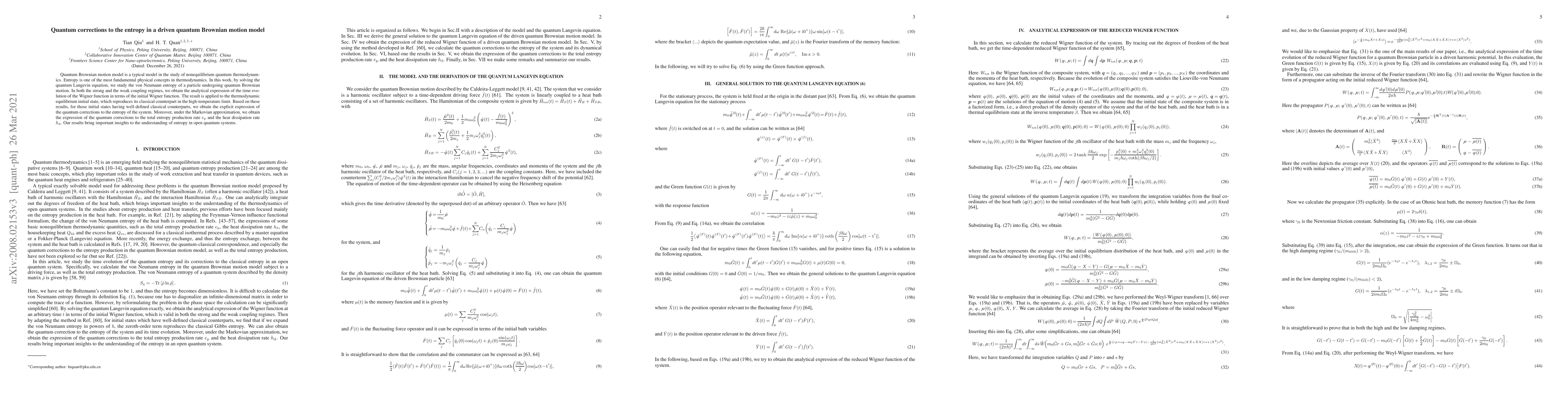 Quantum Brownian motion model is a typical model in the study of nonequilibrium quantum thermodynamics. Entropy is one of the most fundamental physical concepts in thermodynamics. In this work, by solving the quantum Langevin equation, we study the von Neumann entropy of a particle undergoing quantum Brownian motion. In both the strong and the weak coupling regimes, we obtain the analytical expression of the time evolution of the Wigner function in terms of the initial Wigner function. The result is applied to the thermodynamic equilibrium initial state, which reproduces its classical counterpart in the high-temperature limit. Based on these results, for those initial states having well-defined classical counterparts, we obtain the explicit expression of the quantum corrections to the entropy of the system. Moreover, under the Markovian approximation, we obtain the expression of the quantum corrections to the total entropy production rate ${e_{\rm p}}$ and the heat dissipation rate ${h_{\rm d}}$. Our results bring important insights to the understanding of entropy in open quantum systems.