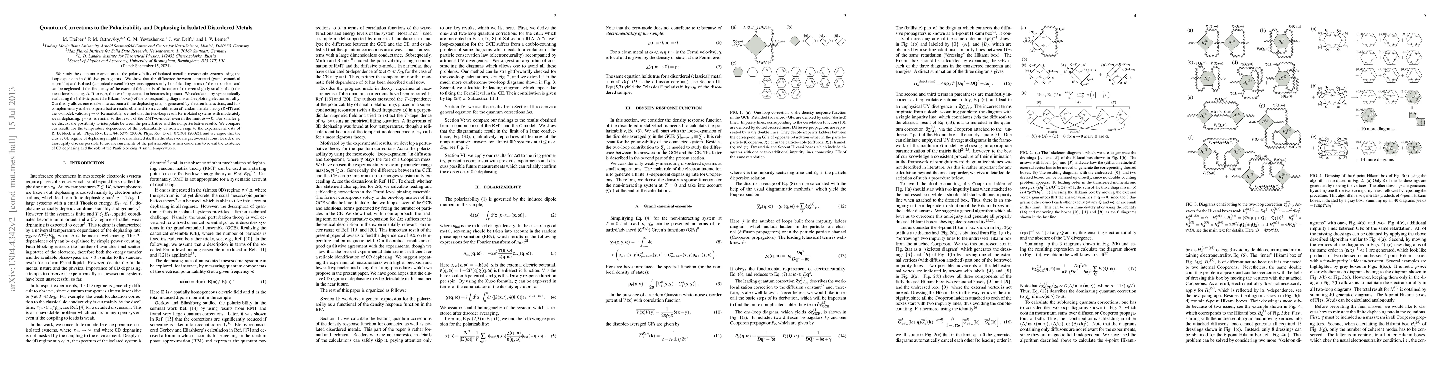 Researchers studied quantum corrections to polarizability in isolated metallic systems using loop-expansion in diffusive propagators, finding that subleading terms can be neglected for certain frequency conditions, and the two-loop correction is similar to non-perturbative results at low dephasing rates.