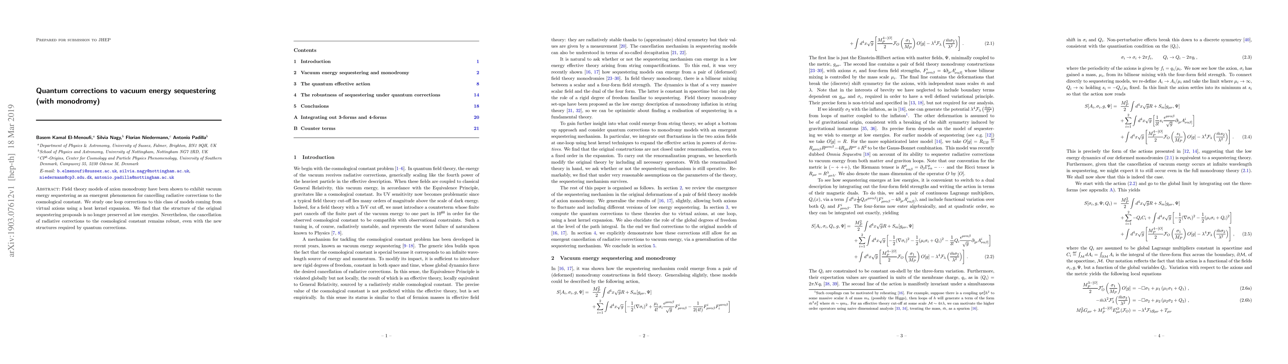 Field theory models of axion monodromy have been shown to exhibit vacuum energy sequestering as an emergent phenomenon for cancelling radiative corrections to the cosmological constant. We study one loop corrections to this class of models coming from virtual axions using a heat kernel expansion. We find that the structure of the original sequestering proposals is no longer preserved at low energies. Nevertheless, the cancellation of radiative corrections to the cosmological constant remains robust, even with the new structures required by quantum corrections.