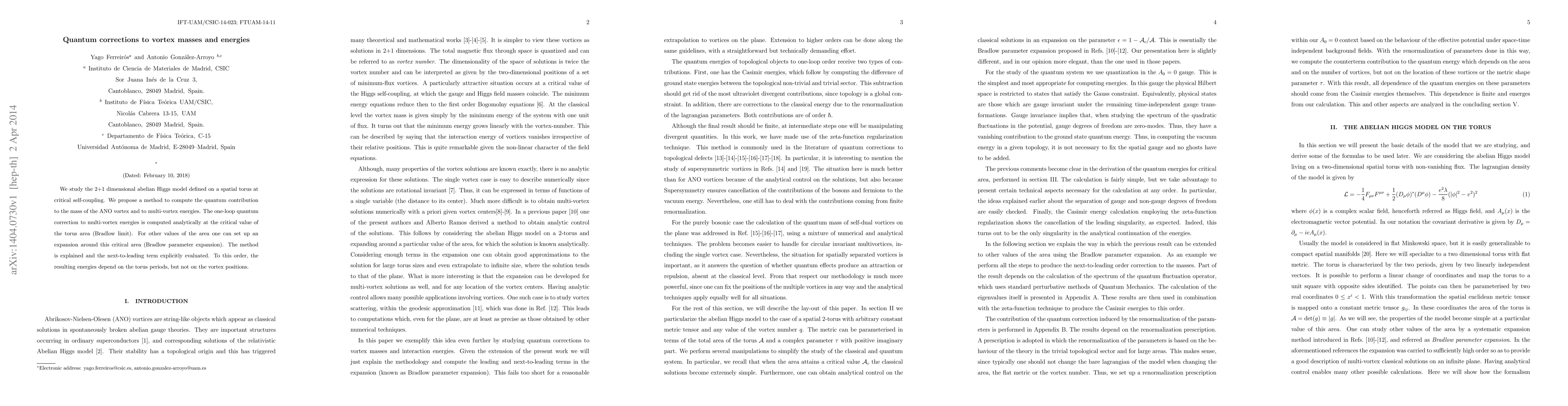 Researchers developed a method to calculate quantum corrections to vortex masses and energies in a 2D Higgs model on a torus at critical self-coupling, revealing new insights into multi-vortex energies and their dependence on the torus area.