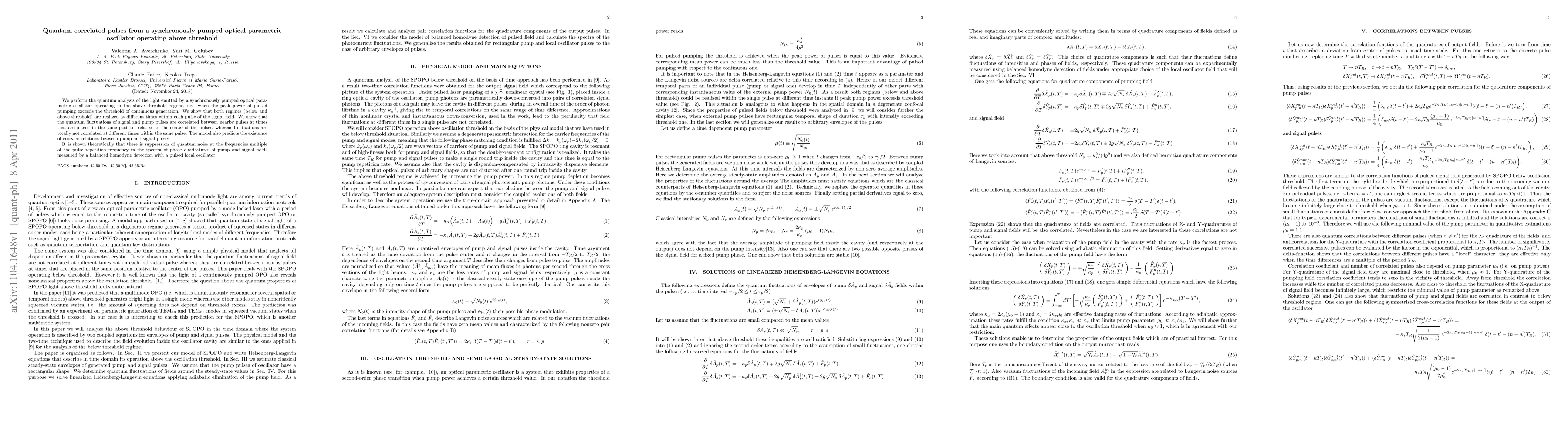 The research performs a quantum analysis of light emitted by a synchronously pumped optical parametric oscillator (SPOPO) operating above threshold, where the peak power of pulsed pumping exceeds the threshold for continuous generation. The study examines both below and above threshold regimes, showing that quantum fluctuations of signal and pump pulses are correlated between nearby pulses at specific times relative to the pulse center.