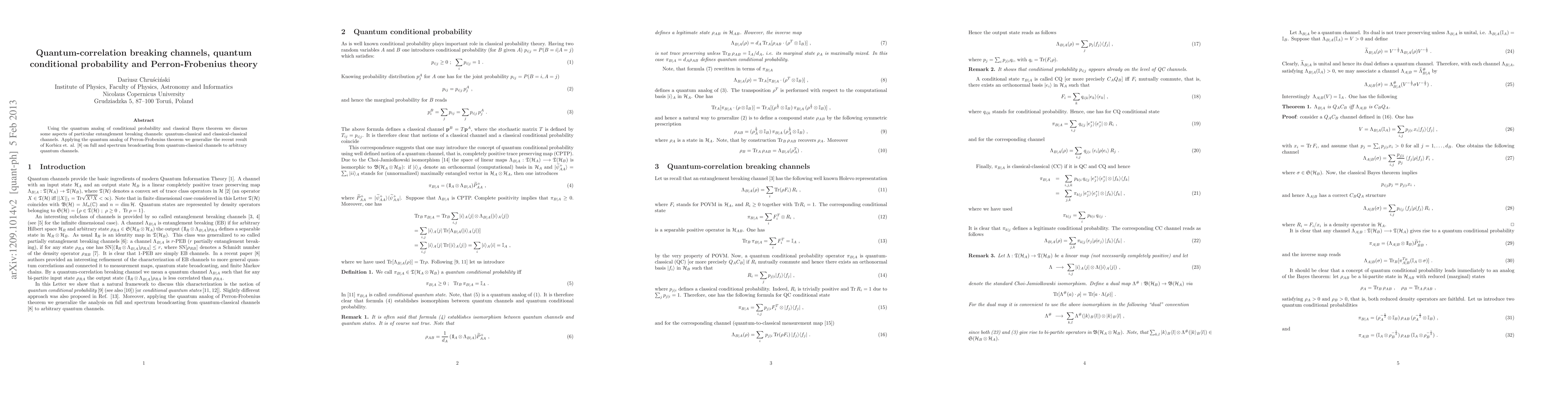 Summary: This paper explores quantum-classical and classical-classical channels using quantum analogs of conditional probability and Bayes theorem, extending the Perron-Frobenius theorem to generalize broadcasting results for arbitrary channels, building on the work of Korbicz et al.