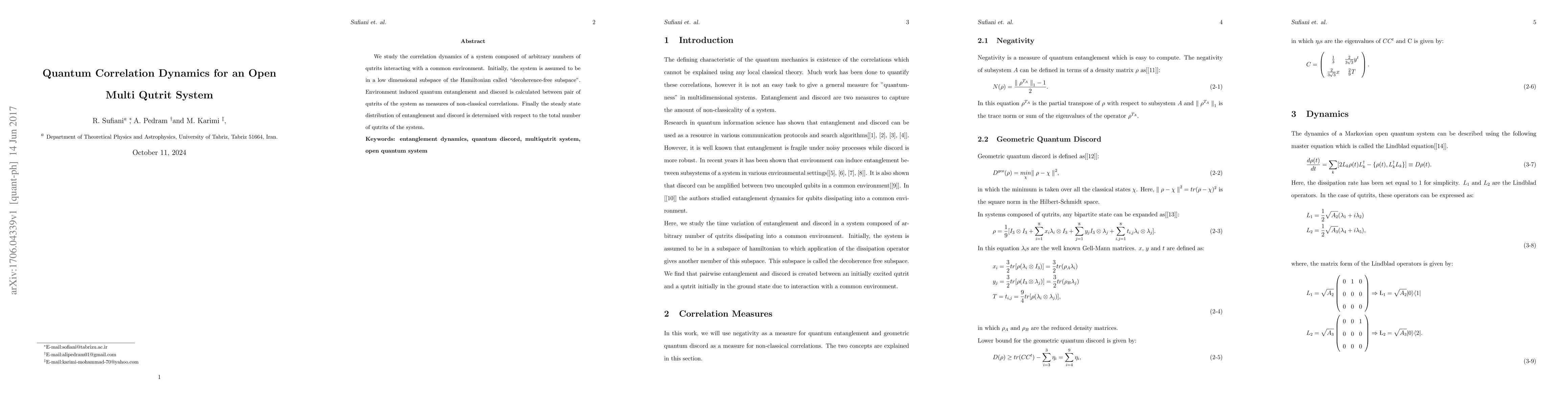Researchers studied the correlation dynamics of a system of qutrits interacting with an environment, finding that entanglement and discord increase as the number of qutrits increases.