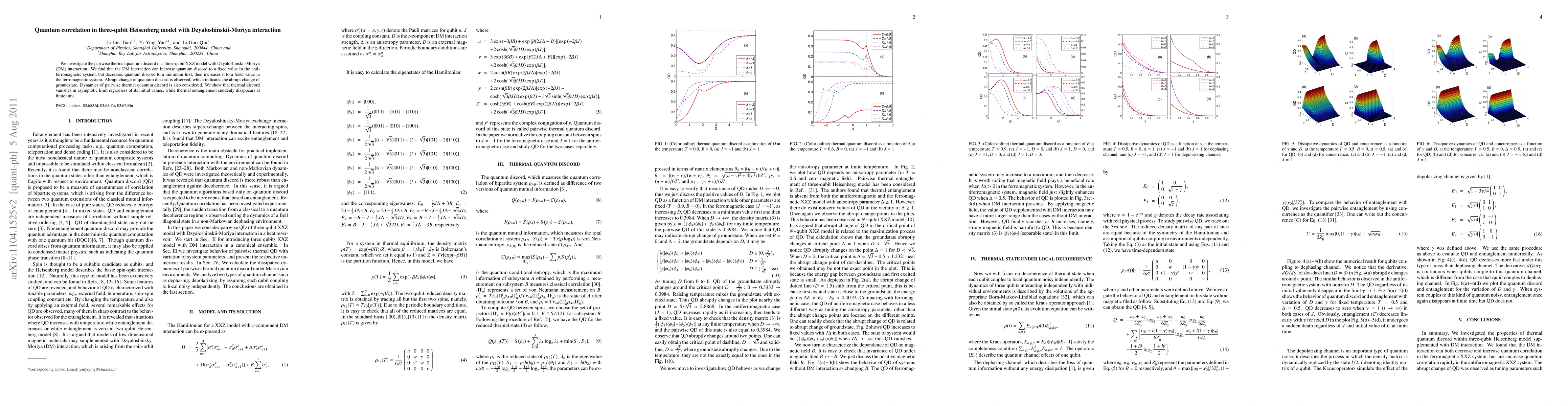 This paper examines the thermal quantum discord in a three-qubit Heisenberg model with Dzyaloshinskii-Moriya interaction, revealing that the DM interaction enhances discord in antiferromagnetic systems and initially reduces but later increases it in ferromagnetic systems. It also notes an abrupt change in quantum discord indicating a groundstate shift and discusses the dynamics showing discord vanishes asymptotically while entanglement disappears at a finite time.