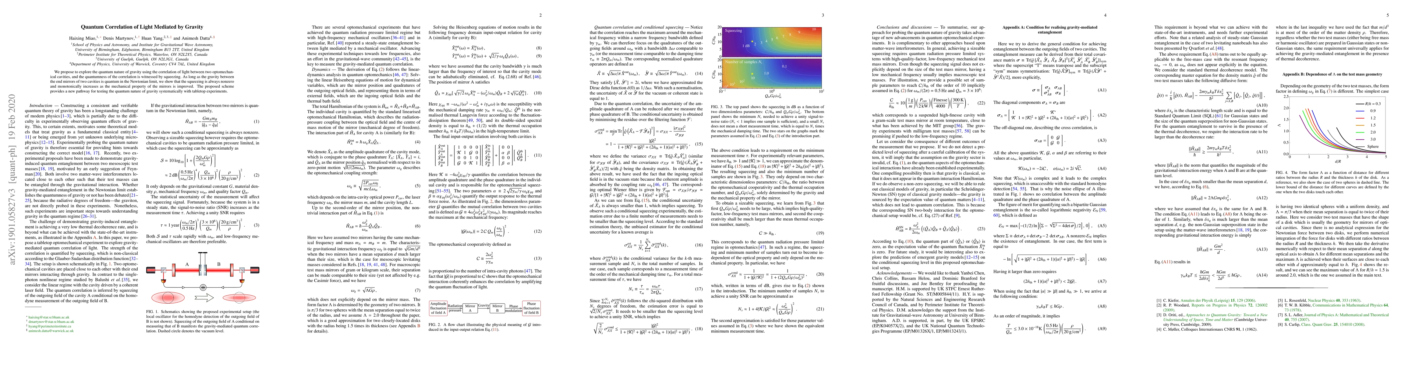 We propose to explore the quantum nature of gravity using the correlation of light between two optomechanical cavities, and the quantumness of the correlation is witnessed by squeezing. As long as the gravity between the end mirrors of two cavities is quantum in the Newtonian limit, we show that the squeezing is always nonzero and monotonically increases as the mechanical property of the mirrors is improved. The proposed scheme provides a new pathway for testing the quantum nature of gravity systematically with tabletop experiments.