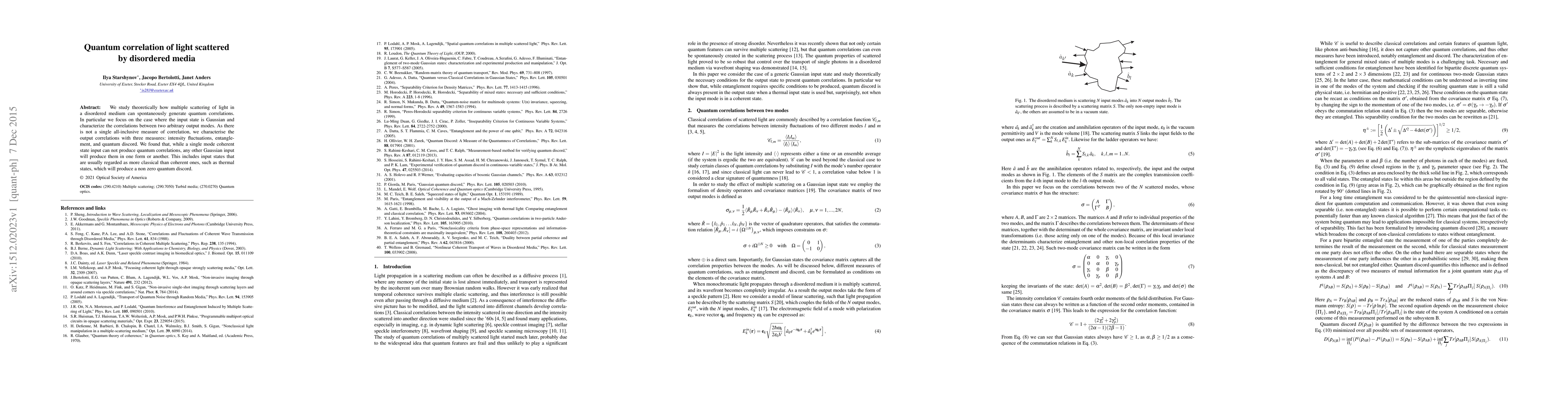 We study theoretically how multiple scattering of light in a disordered medium can spontaneously generate quantum correlations. In particular we focus on the case where the input state is Gaussian and characterize the correlations between two arbitrary output modes. As there is not a single all-inclusive measure of correlation, we characterise the output correlations with three measures: intensity fluctuations, entanglement, and quantum discord. We found that, while a single mode coherent state input can not produce quantum correlations, any other Gaussian input will produce them in one form or another. This includes input states that are usually regarded as more classical than coherent ones, such as thermal states, which will produce a non zero quantum discord.