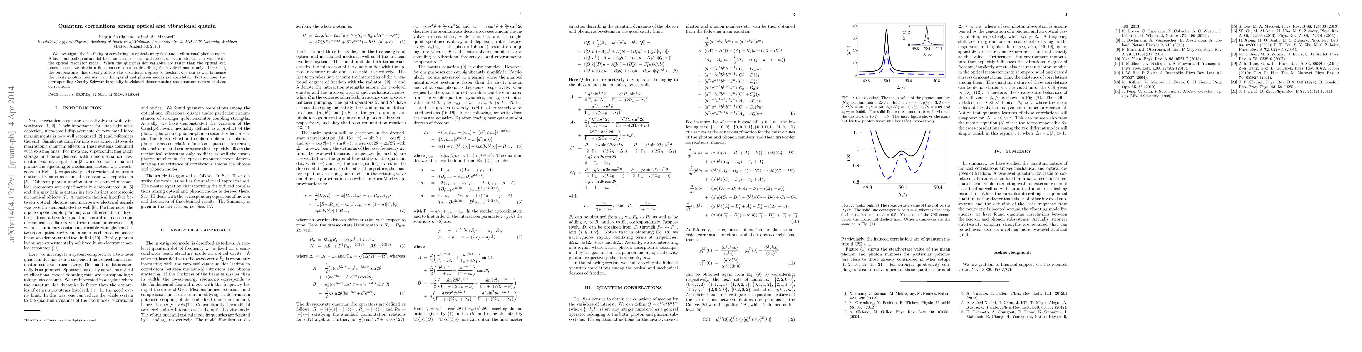 We investigate the feasibility of correlating an optical cavity field and a vibrational phonon mode. A laser pumped quantum dot fixed on a nano-mechanical resonator beam interact as a whole with the optical resonator mode. When the quantum dot variables are faster than the optical and phonon ones, we obtain a final master equation describing the involved modes only. Increasing the temperature, that directly affects the vibrational degrees of freedom, one can as well influence the cavity photon intensity, i.e., the optical and phonon modes are correlated. Furthermore, the corresponding Cauchy-Schwarz inequality is violated demonstrating the quantum nature of those correlations.