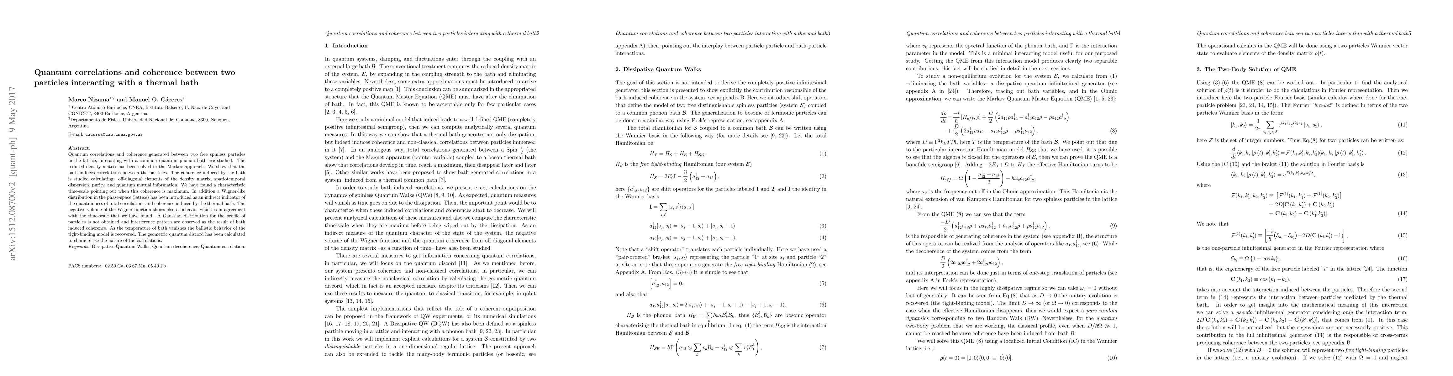 This paper investigates quantum correlations and coherence between two spinless particles interacting with a thermal phonon bath, revealing bath-induced correlations and coherence. The study finds a maximum coherence time-scale and observes non-Gaussian distributions and interference patterns, indicating the quantum nature of the induced correlations.