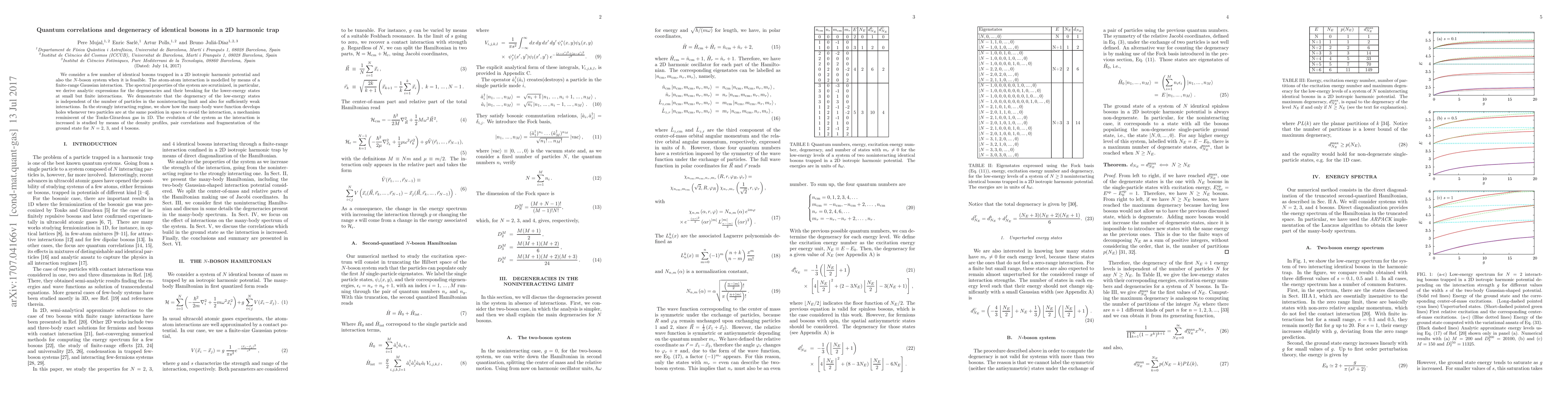 This paper investigates the quantum correlations and degeneracy in a 2D harmonic trap for identical bosons, with a focus on the spectral properties and interaction effects. It reveals that low-energy state degeneracy is unaffected by particle number in the noninteracting and weakly interacting regimes, while strong interactions lead to spatial hole formation to avoid repulsion, akin to the Tonks-Girardeau gas.