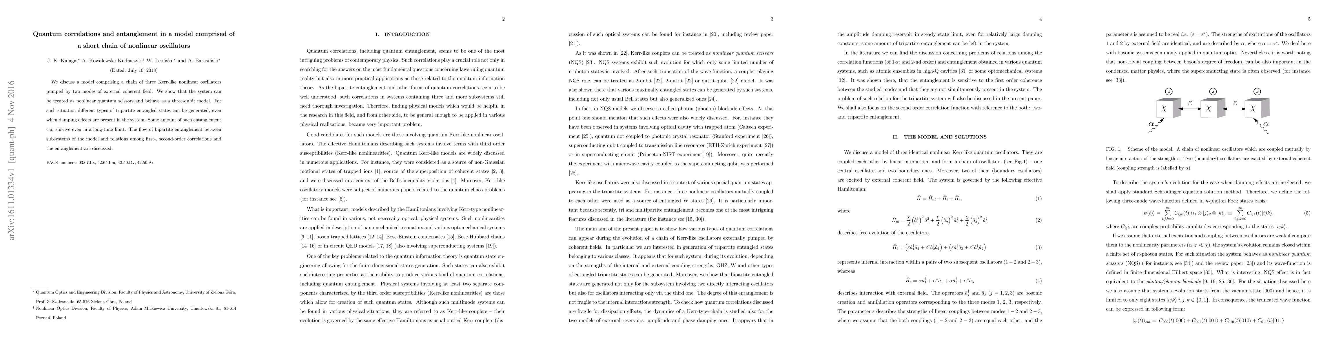 We discuss a model comprised of a chain of three Kerr-like nonlinear oscillators pumped by two modes of external coherent field. We show that the system can be treated as nonlinear quantum scissors and behave as a three-qubit model. For such situation, different types of tripartite entangled states can be generated, even when damping effects are present in the system. Some amount of such entanglement can survive even in a long-time limit. The flow of bipartite entanglement between subsystems of the model and relations among first-order correlations, second-order correlations, and the entanglement are discussed.