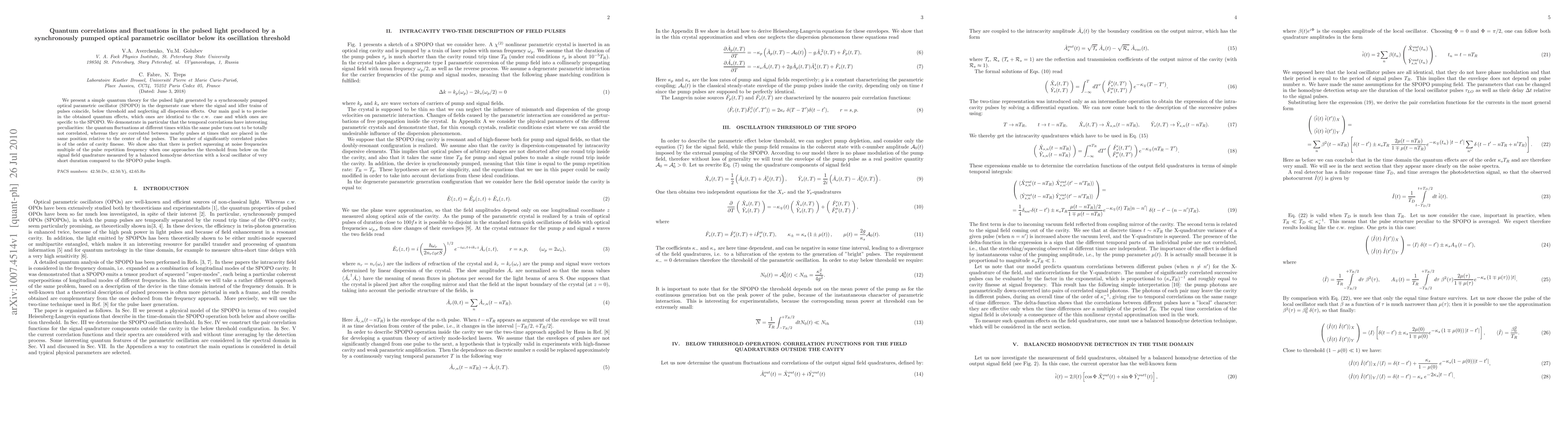 This paper develops a quantum theory for pulsed light from a synchronously pumped optical parametric oscillator (SPOPO) below its oscillation threshold, highlighting unique quantum correlations and fluctuations. It finds that quantum fluctuations within the same pulse are uncorrelated, while those between nearby pulses are correlated, with the number of correlated pulses related to the cavity finesse.