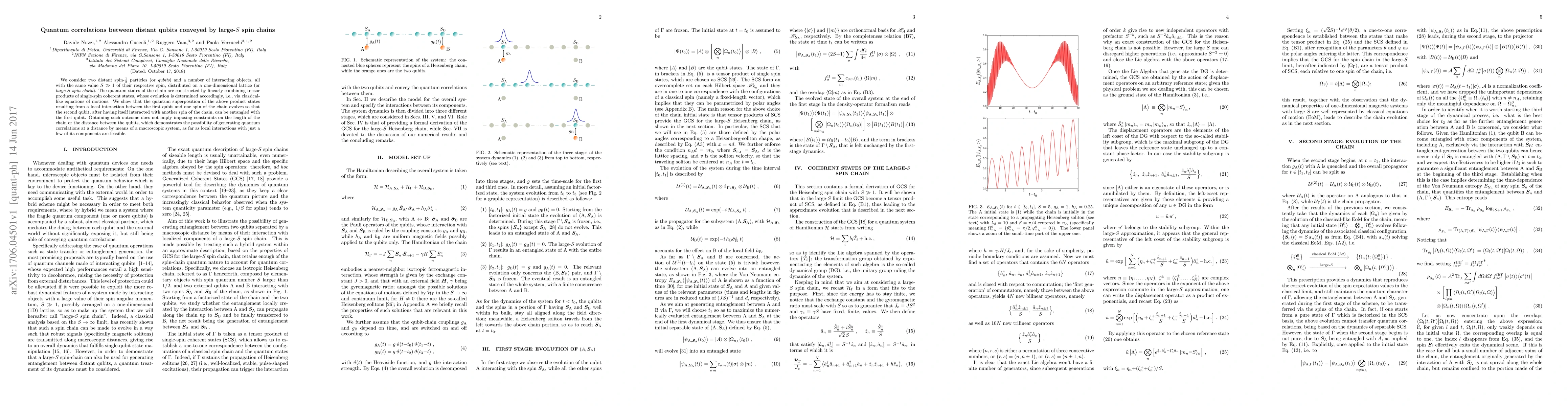 We consider two distant spin-$\frac{1}{2}$ particles (or qubits) and a number of interacting objects, all with the same value $S\gg1$ of their respective spin, distributed on a one-dimensional lattice (or large-$S$ spin chain). The quantum states of the chain are constructed by linearly combining tensor products of single-spin coherent states, whose evolution is determined accordingly, i.e., via classical-like equations of motions. We show that the quantum superposition of the above product states resulting from a local interaction between the first qubit and one spin of the chain evolves so that the second qubit, after having itself interacted with another spin of the chain, can be entangled with the first qubit. Obtaining such outcome does not imply imposing constraints on the length of the chain or the distance between the qubits, which demonstrates the possibility of generating quantum correlations at a distance by means of a macroscopic system, as far as local interactions with just a few of its components are feasible.