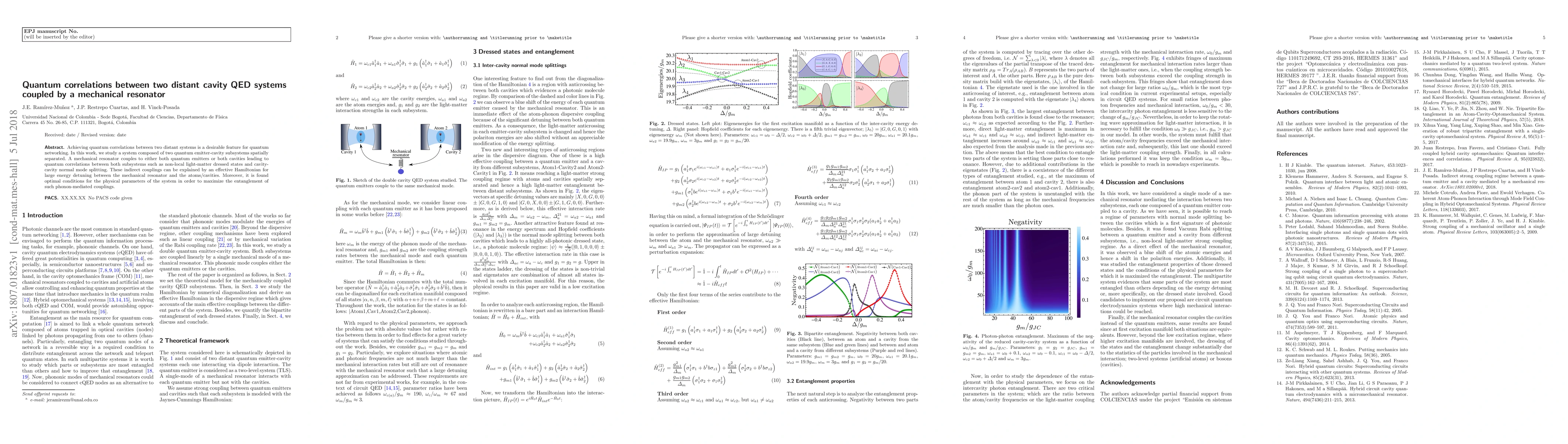 This research paper explores quantum correlations between two distant cavity QED systems connected by a mechanical resonator, which enables non-local light-matter interactions and entanglement.