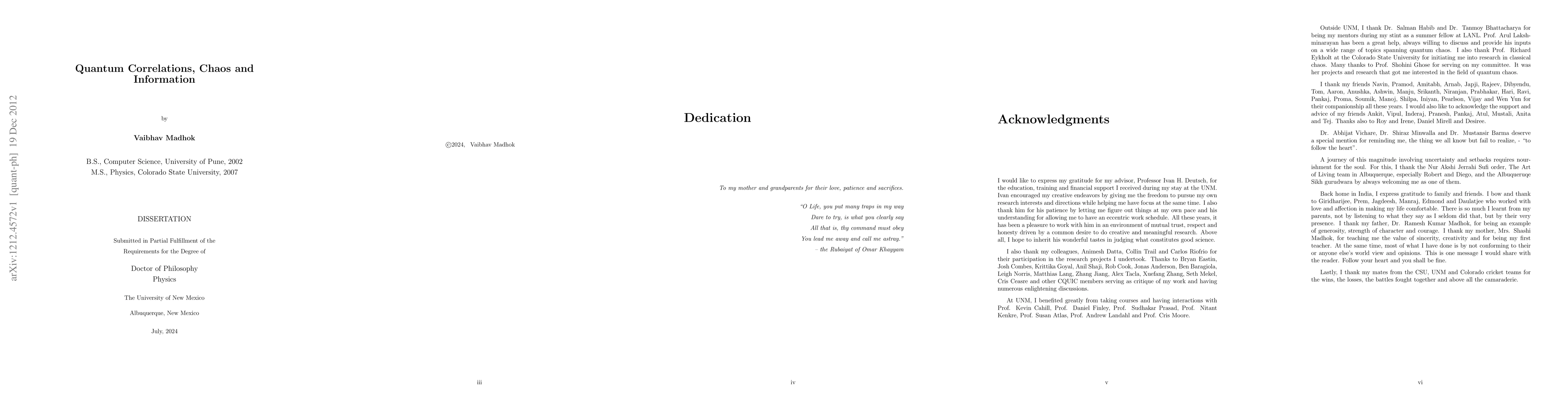 Quantum chaos is the study of quantum systems whose classical description is chaotic. How does chaos manifest itself in the quantum world? In this spirit, we study the dynamical generation of entanglement as a signature of chaos in a system of periodically kicked coupled-tops, where chaos and entanglement arise from the same physical mechanism. The long-time entanglement as a function of the position of an initially localized wave packet very closely correlates with the classical phase space surface of section - it is nearly uniform in the chaotic sea, and reproduces the detailed structure of the regular islands. The uniform value in the chaotic sea is explained by the random state conjecture. As classically chaotic dynamics take localized distributions in phase space to random distributions, quantized versions take localized coherent states to pseudo-random states in Hilbert space. Such random states are highly entangled, with an average value near that of the maximally entangled state. Continuing on our journey to find the footprints of chaos in the quantum world, we explore quantum signatures of classical chaos by studying the rate of information gain in quantum tomography. We find an increase in the rate of information gain and hence higher fidelities in the process when the Floquet maps employed increase in chaoticity. We make predictions for the information gain using random matrix theory in the fully chaotic regime and show a remarkable agreement between the two. The last part of this thesis is devoted to the study of the nature of quantum correlations themselves. We present an operational interpretation of quantum discord based on the quantum state merging protocol. Quantum discord is the markup in the cost of quantum communication in the process of quantum state merging, if one discards relevant prior information.