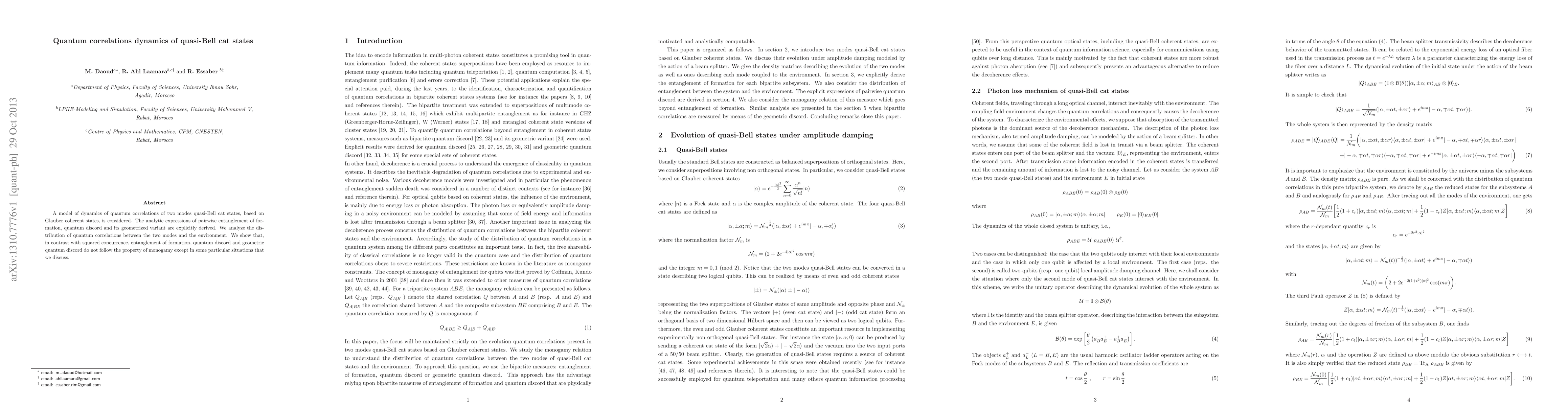 This paper investigates the dynamics of quantum correlations in quasi-Bell cat states using Glauber coherent states, deriving expressions for entanglement, quantum discord, and geometric quantum discord. It reveals that unlike squared concurrence, these measures do not adhere to the monogamy property of entanglement except in specific cases.