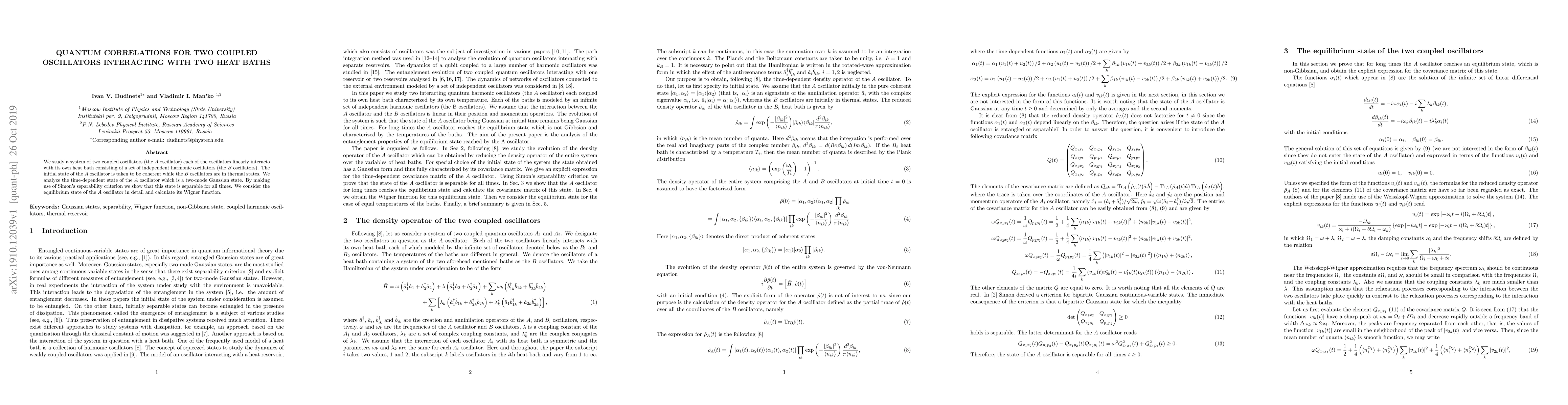 This paper investigates the quantum correlations in a system of two coupled oscillators, each interacting with its own heat bath, under thermal conditions. It demonstrates that the time-dependent state of the coupled oscillators remains separable using Simon's criterion and provides a detailed analysis of the equilibrium state's Wigner function.