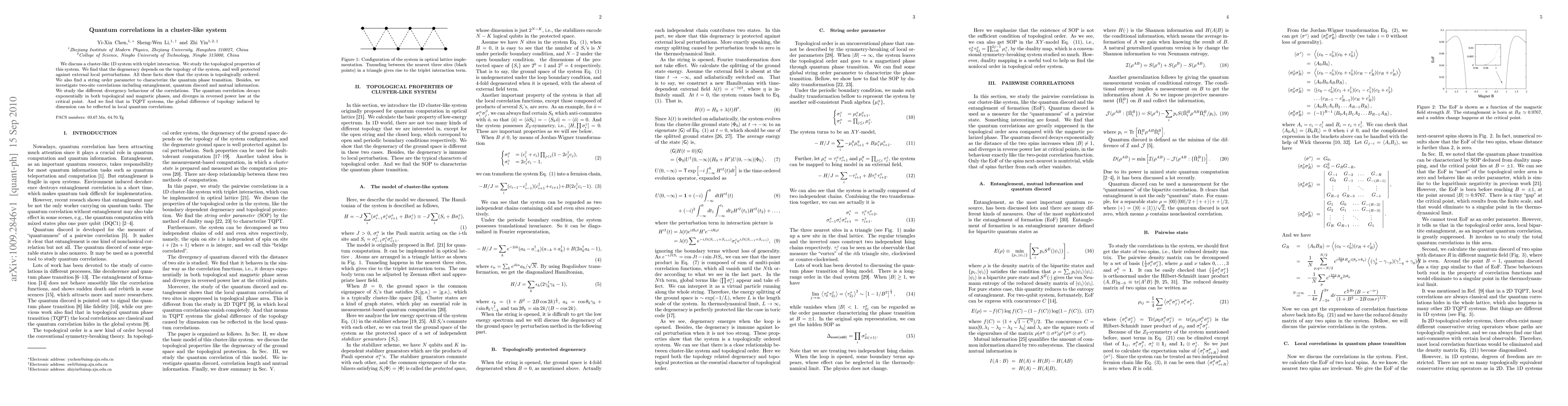 We discuss a cluster-like 1D system with triplet interaction. We study the topological properties of this system. We find that the degeneracy depends on the topology of the system, and well protected against external local perturbations. All these facts show that the system is topologically ordered. We also find a string order parameter to characterize the quantum phase transition. Besides, we investigate two-site correlations including entanglement, quantum discord and mutual information. We study the different divergency behaviour of the correlations. The quantum correlation decays exponentially in both topological and magnetic phases, and diverges in reversed power law at the critical point. And we find that in TQPT systems, the global difference of topology induced by dimension can be reflected in local quantum correlations.