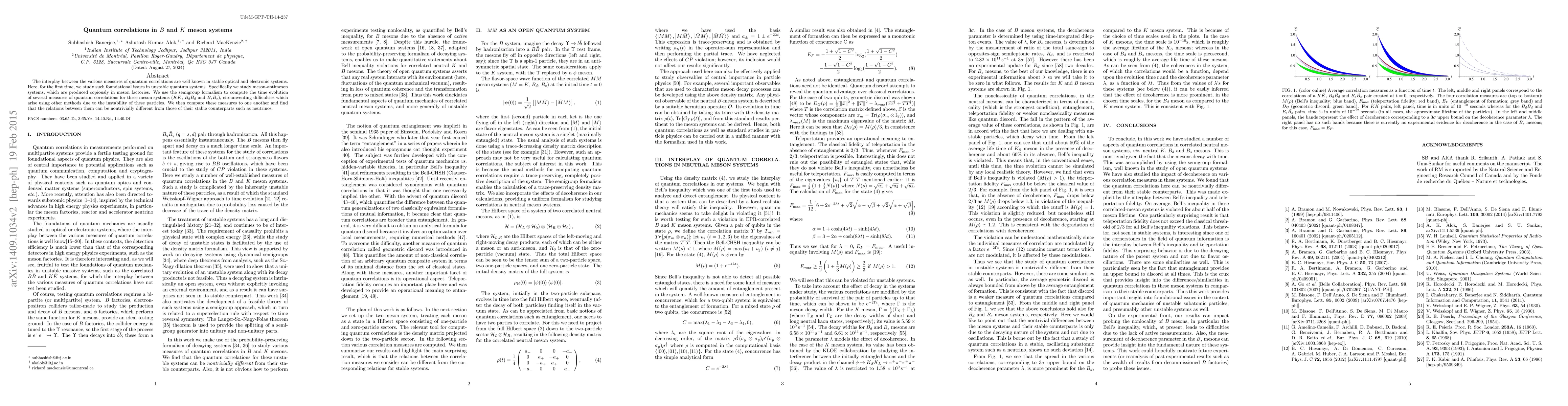 This paper investigates quantum correlations in unstable meson systems (K-Kbar, Bd-Bdbar, Bs-Bsbar) using the semigroup formalism, revealing unique time evolution patterns compared to stable systems like neutrinos. The study highlights the complex relationships between different measures of quantum correlations in these unstable quantum systems.