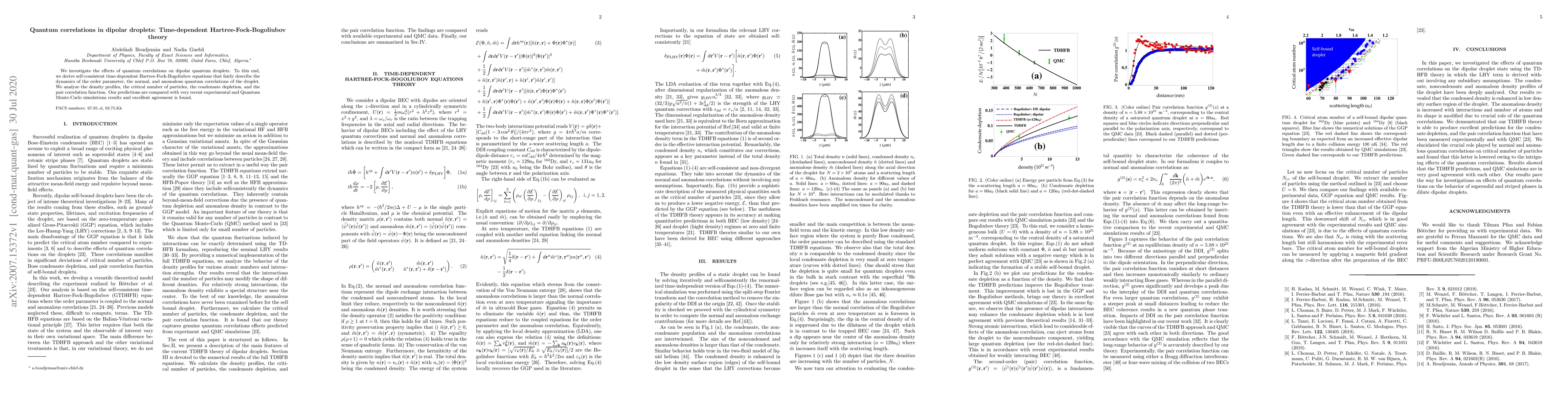 This paper derives time-dependent Hartree-Fock-Bogoliubov equations to study quantum correlations in dipolar quantum droplets, analyzing their density profiles, critical particle numbers, and condensate depletion. The findings show excellent agreement with recent experimental and simulation results.