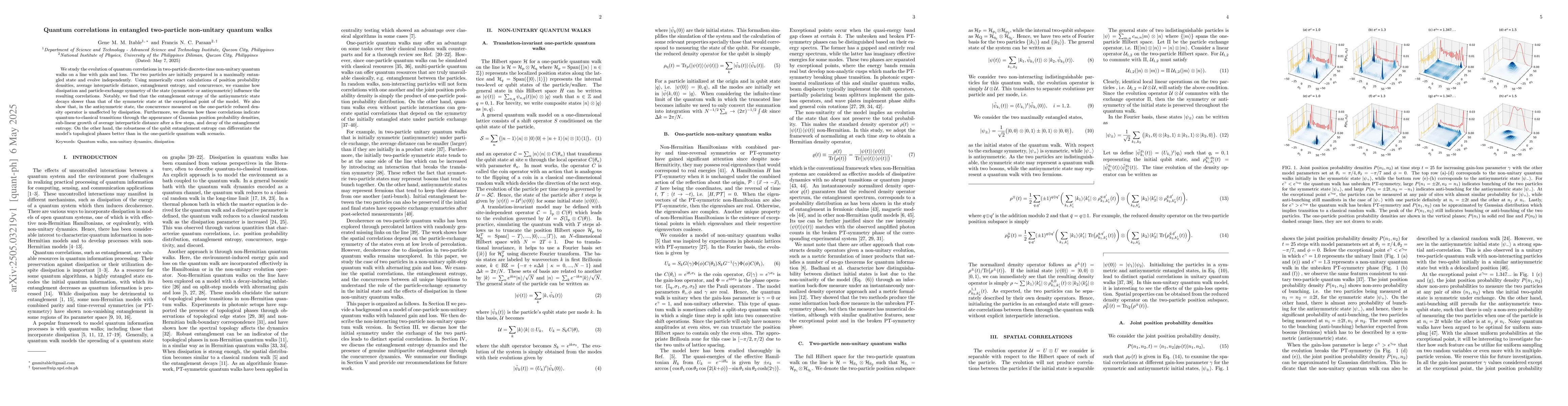 We study the evolution of quantum correlations in two-particle discrete-time non-unitary quantum walks on a line with gain and loss. The two particles are initially prepared in a maximally entangled state and evolve independently. Using numerically exact calculations of position probability densities, average interparticle distance, entanglement entropy, and concurrence, we examine how dissipation and particle-exchange symmetry of the state (symmetric or antisymmetric) influence the resulting correlations. Notably, we find that the entanglement entropy of the antisymmetric state decays slower than that of the symmetric state at the exceptional point of the model. We also show that, in the antisymmetric state, the concurrence measured on the one-particle reduced density operator is unaffected by dissipation. Furthermore, we discuss how these correlations indicate quantum-to-classical transitions through the appearance of Gaussian position probability densities, sub-linear growth of average interparticle distance after a few steps, and decay of the entanglement entropy. On the other hand, the robustness of the qubit entanglement entropy can differentiate the model's topological phases better than in the one-particle quantum walk scenario.