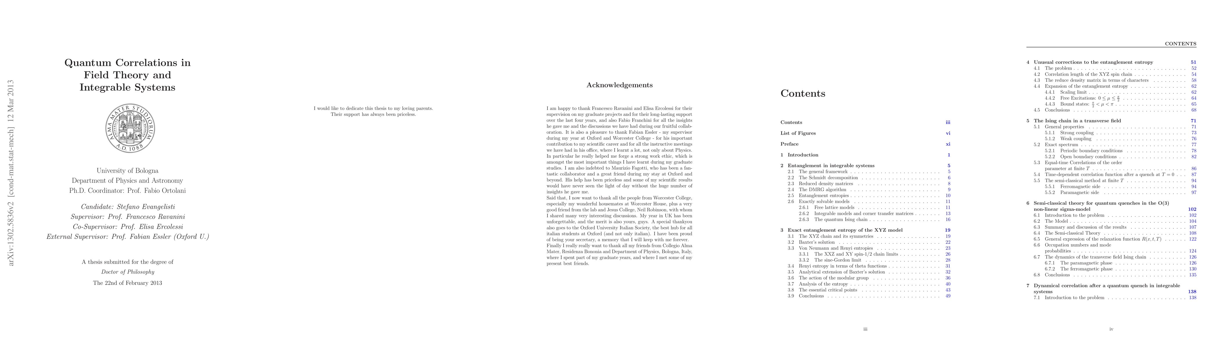 This PhD thesis explores quantum correlations in integrable systems, focusing on entanglement properties and dynamical correlators after a quantum quench, revealing general results about the dynamics of correlation functions and their relation to statistical ensembles.