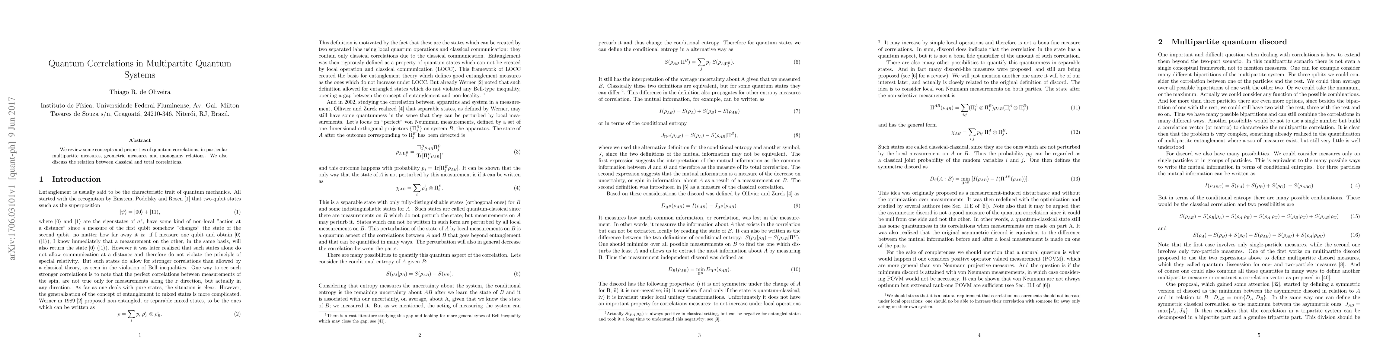 Summary: This paper reviews quantum correlations in multipartite systems, focusing on measures like multipartite and geometric correlations, monogamy relations, and the distinctions between classical and total correlations. It highlights the unique properties of quantum correlations in complex quantum systems.
