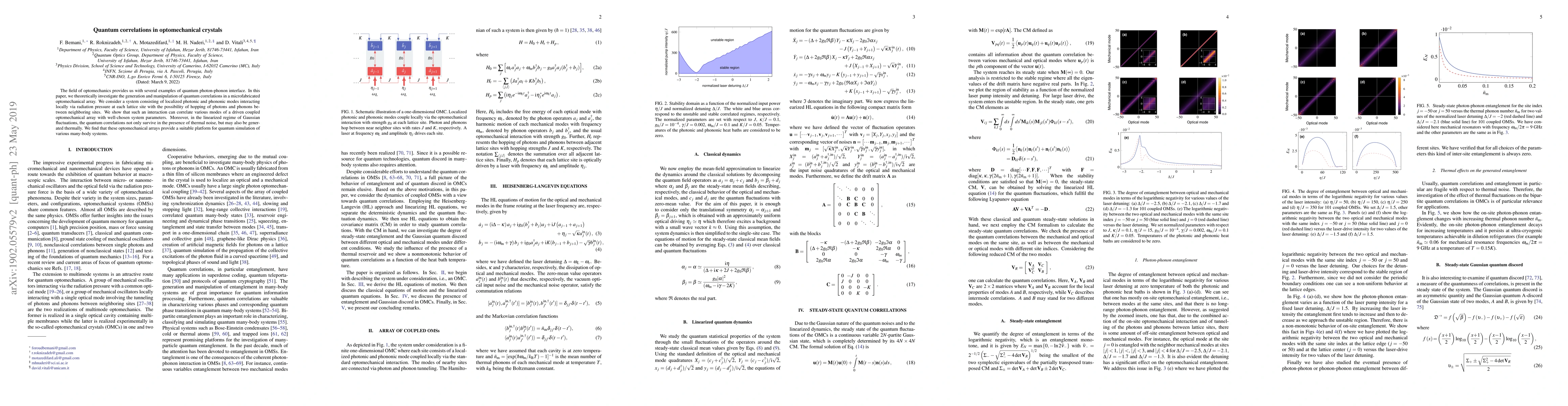 The field of optomechanics provides us with several examples of quantum photon-phonon interface. In this paper, we theoretically investigate the generation and manipulation of quantum correlations in a microfabricated optomechanical array. We consider a system consisting of localized photonic and phononic modes interacting locally via radiation pressure at each lattice site with the possibility of hopping of photons and phonons between neighboring sites. We show that such an interaction can correlate various modes of a driven coupled optomechanical array with well-chosen system parameters. Moreover, in the linearized regime of Gaussian fluctuations, the quantum correlations not only survive in the presence of thermal noise, but may also be generated thermally. We find that these optomechanical arrays provide a suitable platform for quantum simulation of various many-body systems.