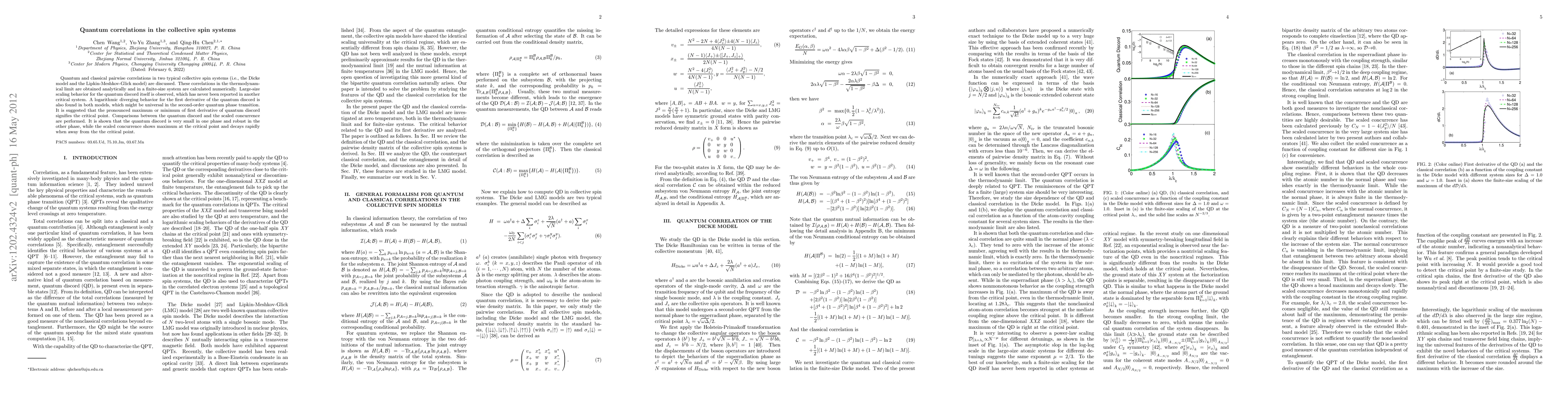 Quantum and classical pairwise correlations in two typical collective spin systems (i.e., the Dicke model and the Lipkin-Meshkov-Glick model) are discussed. These correlations in the thermodynamical limit are obtained analytically and in a finite-size system are calculated numerically. Large-size scaling behavior for the quantum discord itself is observed, which has never been reported in another critical system. A logarithmic diverging behavior for the first derivative of the quantum discord is also found in both models, which might be universal in the second-order quantum phase transition. It is suggested that the pronounced maximum or minimum of first derivative of quantum discord signifies the critical point. Comparisons between the quantum discord and the scaled concurrence are performed. It is shown that the quantum discord is very small in one phase and robust in the other phase, while the scaled concurrence shows maximum at the critical point and decays rapidly when away from the the critical point.