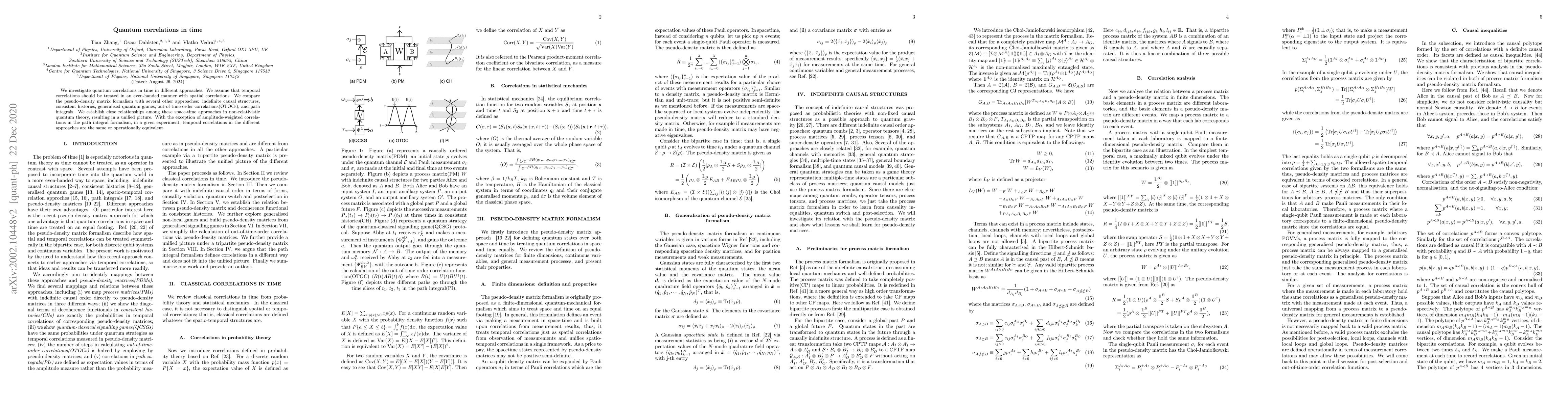 This paper explores quantum correlations in time, comparing various theoretical frameworks including pseudo-density matrices, indefinite causal structures, and out-of-time-order correlations to establish a unified picture of temporal correlations in non-relativistic quantum theory. It concludes that, except for path integral formalism, temporal correlations are operationally equivalent across different approaches.
