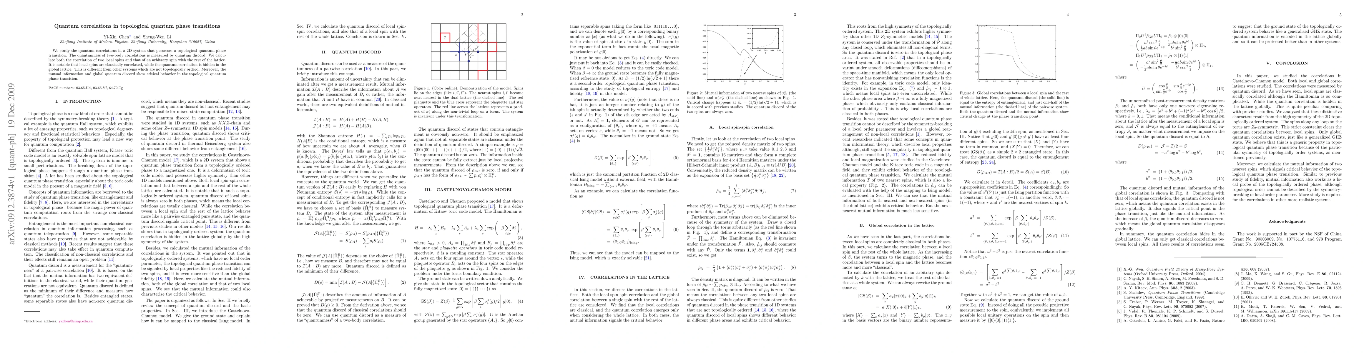 We study the quantum correlations in a 2D system that possesses a topological quantum phase transition. The quantumness of two-body correlations is measured by quantum discord. We calculate both the correlation of two local spins and that of an arbitrary spin with the rest of the lattice. It is notable that local spins are classically correlated, while the quantum correlation is hidden in the global lattice. This is different from other systems which are not topologically orderd. Moreover, the mutual information and global quantum discord show critical behavior in the topological quantum phase transition.