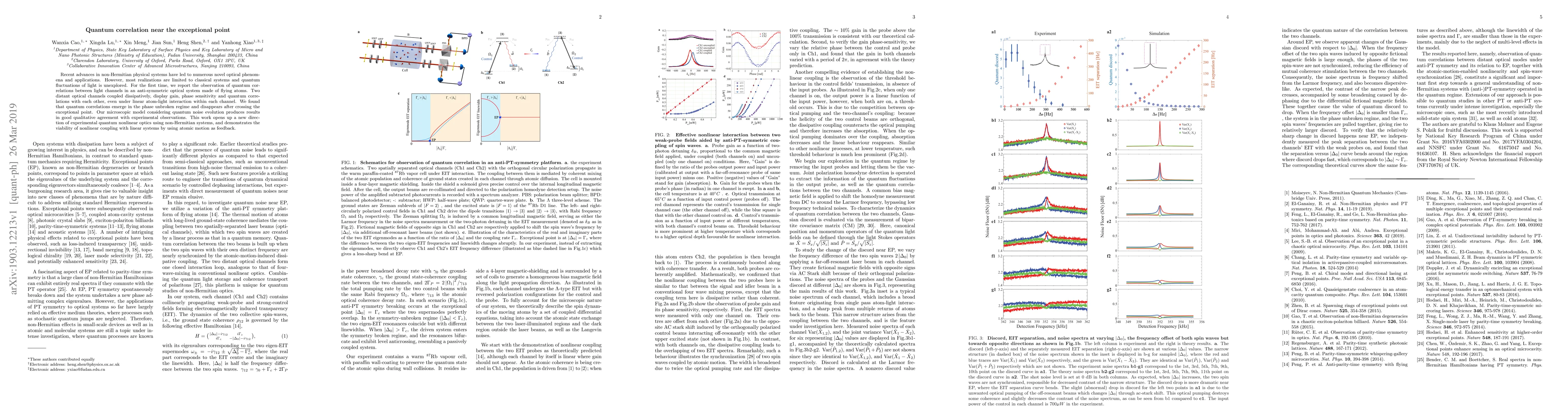 Recent advances in non-Hermitian physical systems have led to numerous novel optical phenomena and applications. However, most realizations are limited to classical systems and quantum fluctuations of light is unexplored. For the first time, we report the observation of quantum correlations between light channels in an anti-symmetric optical system made of flying atoms. Two distant optical channels coupled dissipatively, display gain, phase sensitivity and quantum correlations with each other, even under linear atom-light interaction within each channel. We found that quantum correlations emerge in the phase unbroken regime and disappears after crossing the exceptional point. Our microscopic model considering quantum noise evolution produces results in good qualitative agreement with experimental observations. This work opens up a new direction of experimental quantum nonlinear optics using non-Hermitian systems, and demonstrates the viability of nonlinear coupling with linear systems by using atomic motion as feedback.