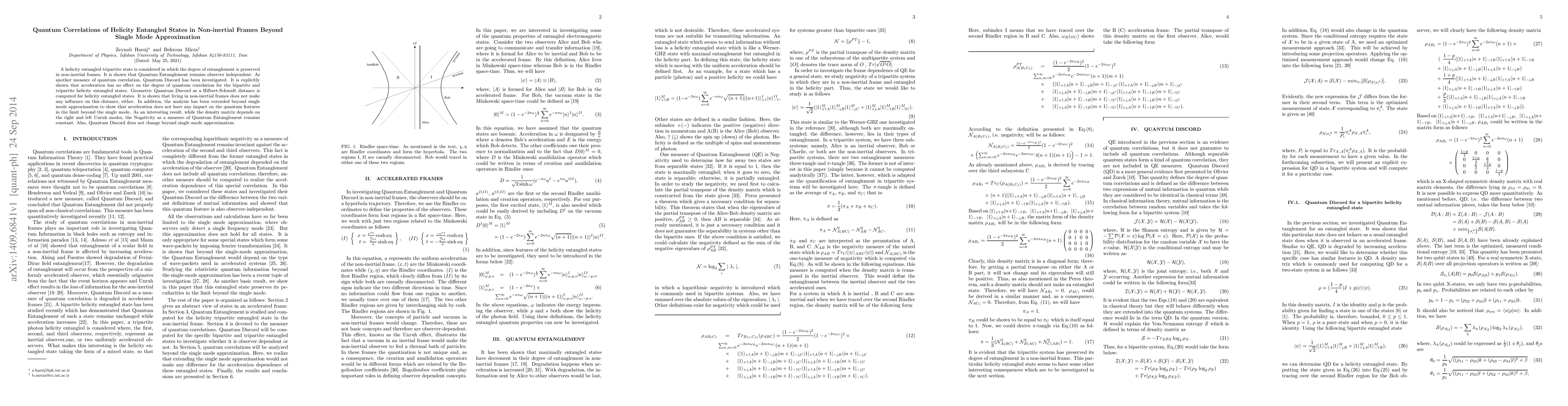 A helicity entangled tripartite state is considered in which the degree of entanglement is preserved in non-inertial frames. It is shown that Quantum Entanglement remains observer independent. As another measure of quantum correlation, Quantum Discord has been investigated. It is explicitly shown that acceleration has no effect on the degree of quantum correlation for the bipartite and tripartite helicity entangled states. Geometric Quantum Discord as a Hilbert-Schmidt distance is computed for helicity entangled states. It is shown that living in non-inertial frames does not make any influence on this distance, either. In addition, the analysis has been extended beyond single mode approximation to show that acceleration does not have any impact on the quantum features in the limit beyond the single mode. As an interesting result, while the density matrix depends on the right and left Unruh modes, the Negativity as a measure of Quantum Entanglement remains constant. Also, Quantum Discord does not change beyond single mode approximation.