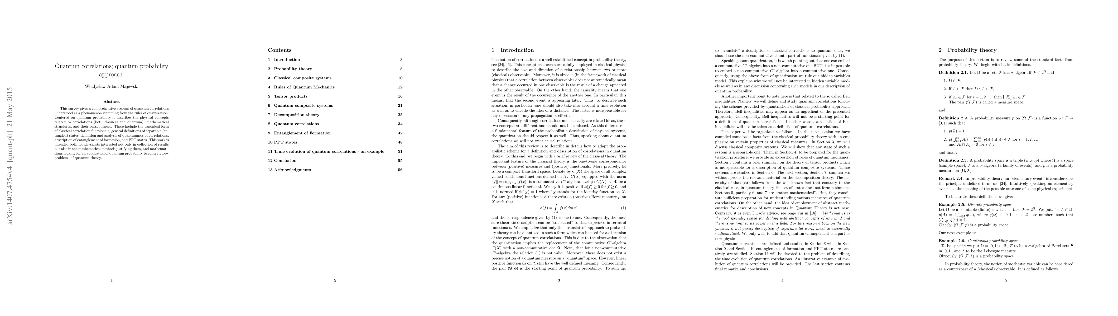 This survey gives a comprehensive account of quantum correlations understood as a phenomenon stemming from the rules of quantization. Centered on quantum probability it describes the physical concepts related to correlations (both classical and quantum), mathematical structures, and their consequences. These include the canonical form of classical correlation functionals, general definitions of separable (entangled) states, definition and analysis of quantumness of correlations, description of entanglement of formation, and PPT states. This work is intended both for physicists interested not only in collection of results but also in the mathematical methods justifying them, and mathematicians looking for an application of quantum probability to concrete new problems of quantum theory.