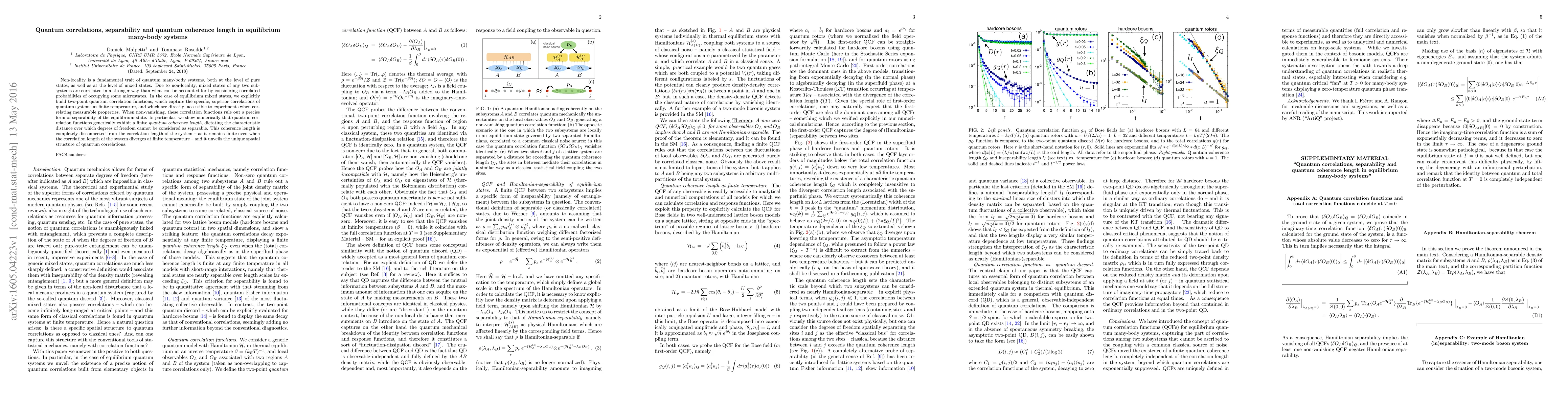 Non-locality is a fundamental trait of quantum many-body systems, both at the level of pure states, as well as at the level of mixed states. Due to non-locality, mixed states of any two subsystems are correlated in a stronger way than what can be accounted for by considering correlated probabilities of occupying some microstates. In the case of equilibrium mixed states, we explicitly build two-point quantum correlation functions, which capture the specific, superior correlations of quantum systems at finite temperature, and which are directly { accessible to experiments when correlating measurable properties}. When non-vanishing, these correlation functions rule out a precise form of separability of the equilibrium state. In particular, we show numerically that quantum correlation functions generically exhibit a finite \emph{quantum coherence length}, dictating the characteristic distance over which degrees of freedom cannot be considered as separable. This coherence length is completely disconnected from the correlation length of the system -- as it remains finite even when the correlation length of the system diverges at finite temperature -- and it unveils the unique spatial structure of quantum correlations.