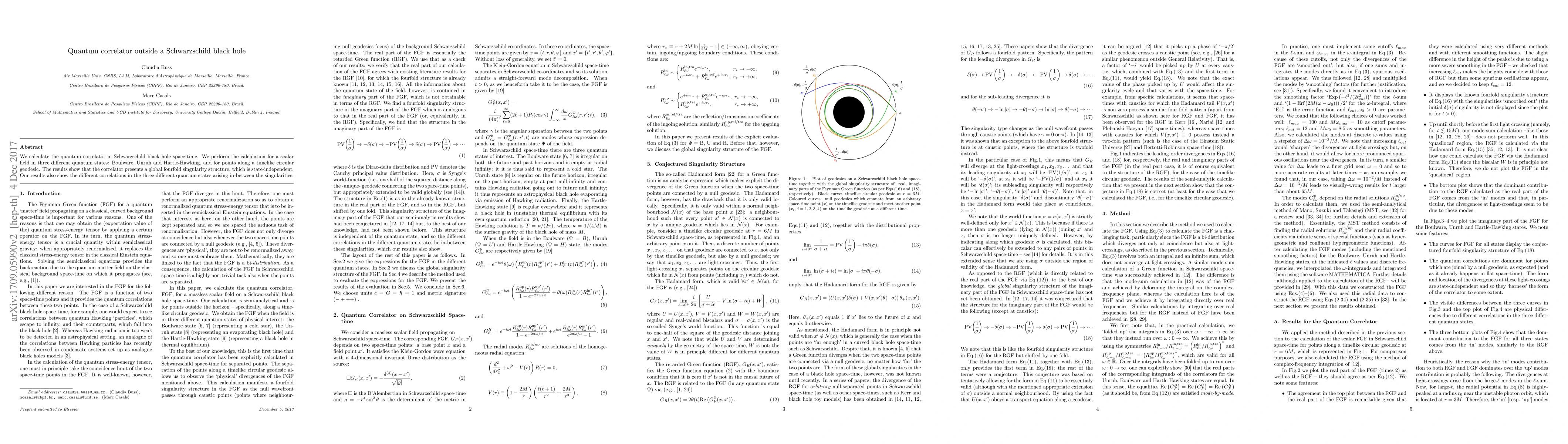 We calculate the quantum correlator in Schwarzschild black hole space-time. We perform the calculation for a scalar field in three different quantum states: Boulware, Unruh and Hartle-Hawking, and for points along a timelike circular geodesic. The results show that the correlator presents a global fourfold singularity structure, which is state-independent. Our results also show the different correlations in the three different quantum states arising in-between the singularities.
