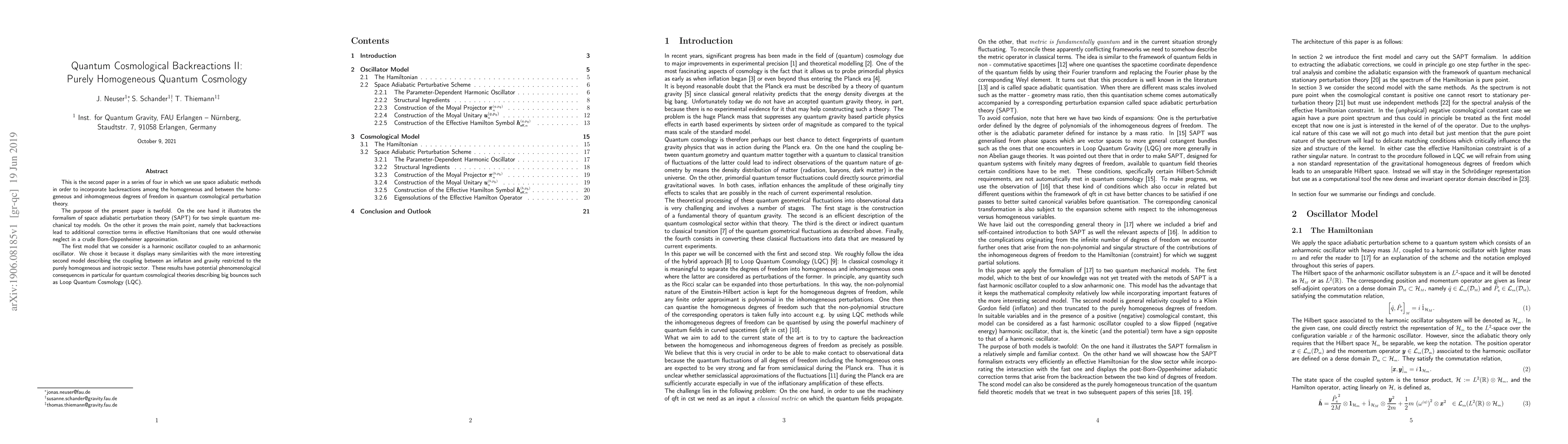 This is the second paper in a series of four in which we use space adiabatic methods in order to incorporate backreactions among the homogeneous and between the homogeneous and inhomogeneous degrees of freedom in quantum cosmological perturbation theory. The purpose of the present paper is twofold. On the one hand, it illustrates the formalism of space adiabatic perturbation theory (SAPT) for two simple quantum mechanical toy models. On the other, it proves the main point, namely that backreactions lead to additional correction terms in effective Hamiltonians that one would otherwise neglect in a crude Born-Oppenheimer approximation. The first model that we consider is a harmonic oscillator coupled to an anharmonic oscillator. We chose it because it displays many similarities with the more interesting second model describing the coupling between an inflaton and gravity restricted to the purely homogeneous and isotropic sector. These results have potential phenomenological consequences in particular for quantum cosmological theories describing big bounces such as Loop Quantum Cosmology (LQC).