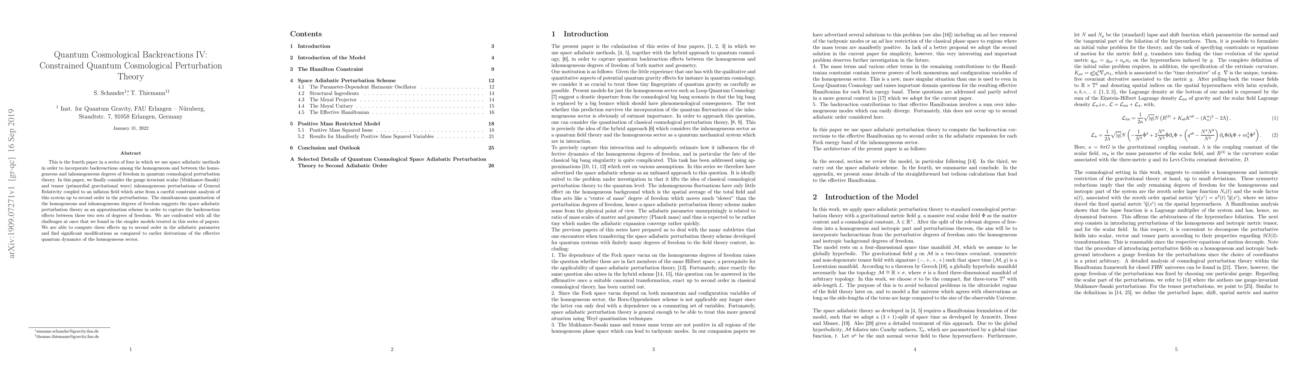 This is the fourth paper in a series of four in which we use space adiabatic methods in order to incorporate backreactions among the homogeneous and between the homogeneous and inhomogeneous degrees of freedom in quantum cosmological perturbation theory. In this paper, we finally consider the gauge invariant scalar (Mukhanov-Sasaki) and tensor (primordial gravitational wave) inhomogeneous perturbations of General Relativity coupled to an inflaton field which arise from a careful constraint analysis of this system up to second order in the perturbations. The simultaneous quantisation of the homogeneous and inhomogeneous degrees of freedom suggests the space adiabatic perturbation theory as an approximation scheme in order to capture the backreaction effects between these two sets of degrees of freedom. We are confronted with all the challenges at once that we found in the simpler models treated in this series of papers. We are able to compute these effects up to second order in the adiabatic parameter and find significant modifications as compared to earlier derivations of the effective quantum dynamics of the homogeneous sector.