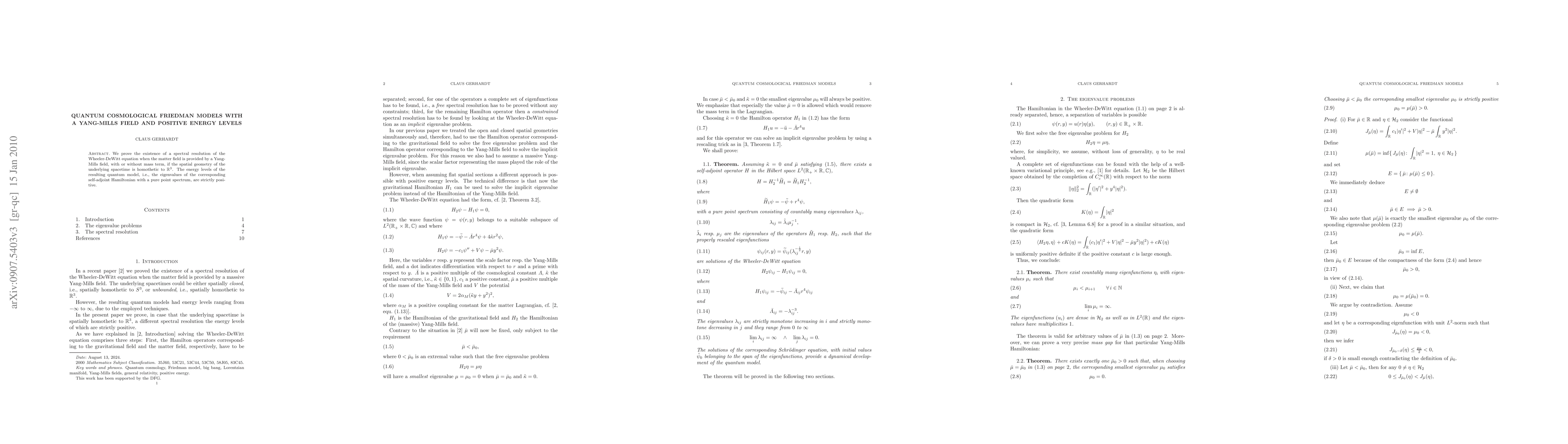 This paper proves the existence of a spectral resolution for the Wheeler-DeWitt equation in quantum cosmological Friedman models with a Yang-Mills field, showing that the resulting quantum model has strictly positive energy levels when the spatial geometry is homothetic to $\R[3]$.