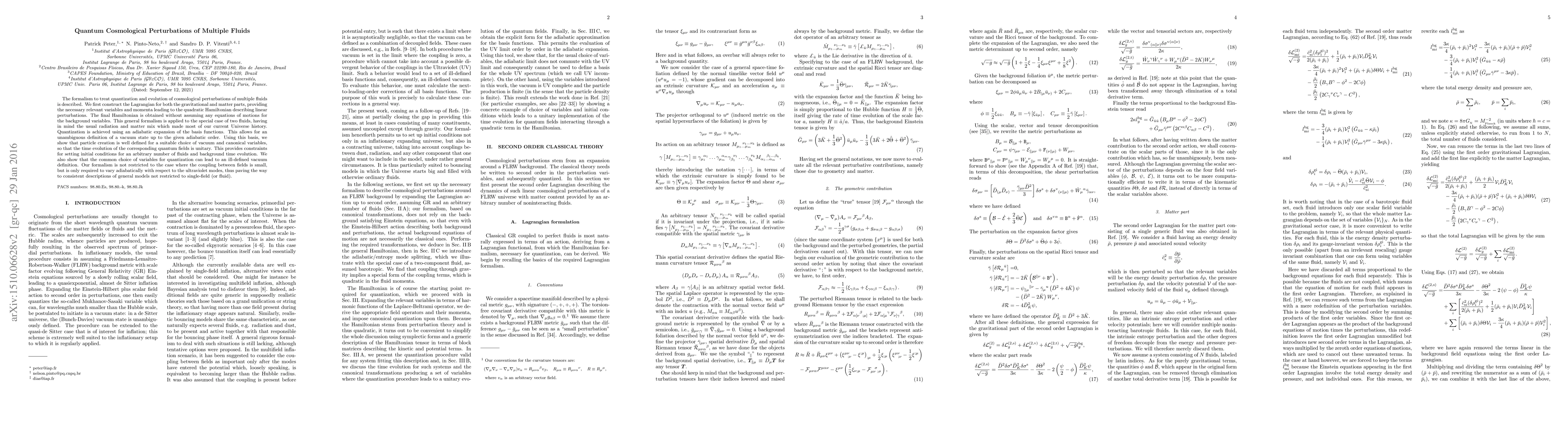 The formalism to treat quantization and evolution of cosmological perturbations of multiple fluids is described. We first construct the Lagrangian for both the gravitational and matter parts, providing the necessary relevant variables and momenta leading to the quadratic Hamiltonian describing linear perturbations. The final Hamiltonian is obtained without assuming any equations of motions for the background variables. This general formalism is applied to the special case of two fluids, having in mind the usual radiation and matter mix which made most of our current Universe history. Quantization is achieved using an adiabatic expansion of the basis functions. This allows for an unambiguous definition of a vacuum state up to the given adiabatic order. Using this basis, we show that particle creation is well defined for a suitable choice of vacuum and canonical variables, so that the time evolution of the corresponding quantum fields is unitary. This provides constraints for setting initial conditions for an arbitrary number of fluids and background time evolution. We also show that the common choice of variables for quantization can lead to an ill-defined vacuum definition. Our formalism is not restricted to the case where the coupling between fields is small, but is only required to vary adiabatically with respect to the ultraviolet modes, thus paving the way to consistent descriptions of general models not restricted to single-field (or fluid).